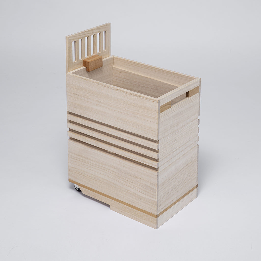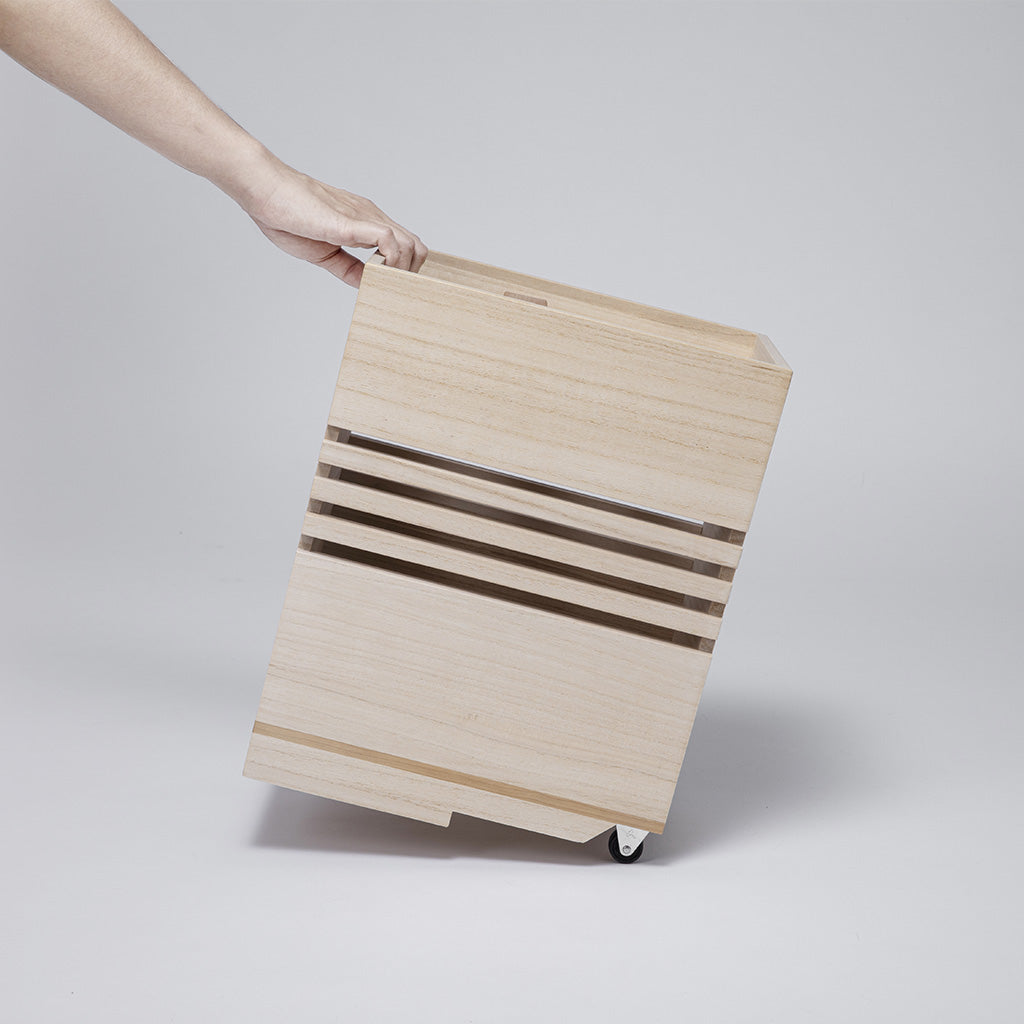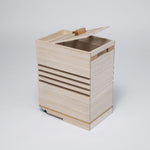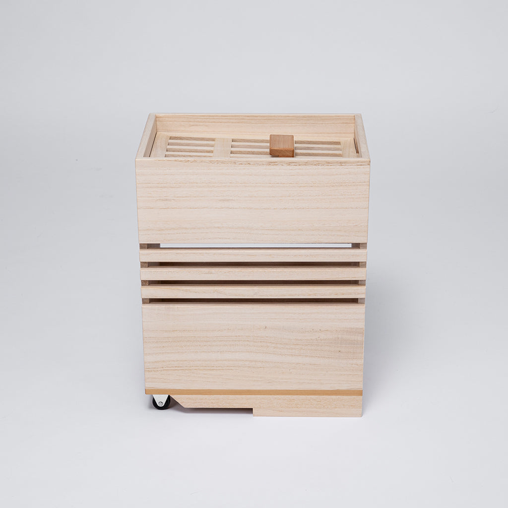 木箱內側底部棧板的設計和上蓋之間的間隙,可讓空氣順暢流通,在潮濕環境中也可自動調節濕氣。大容量野菜保存附有手把與輪子,單手即可輕鬆移動。容量大卻不占空間,可至於櫥櫃中使用。混用櫻桃木的結構,讓米箱整體更為堅固耐用。