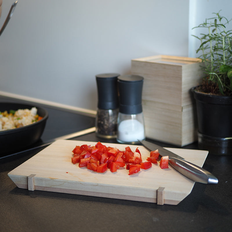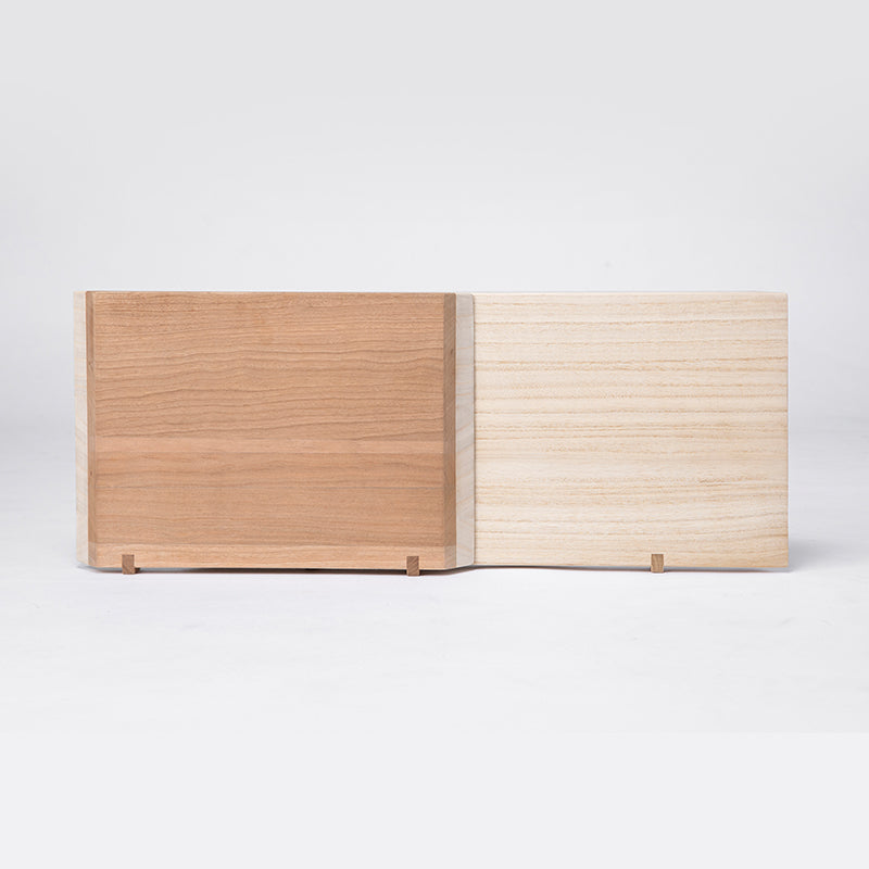 一面桐木軟韌,一面櫻桃木堅固耐用,可配合使用習慣、食材和刀具的種類,選用最佳的表面硬度。下方設置小木腳可站立在檯面,便於陰乾。切面用磨砂紙即可去除刀痕恢復原本光滑面,無化學塗層無多餘加工,環保無毒又實用。