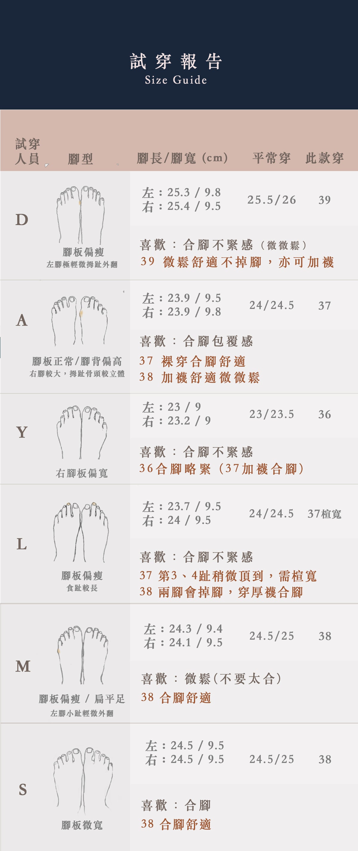 註:每雙鞋款皆為手工訂製,恕不退換,下單前請參考尺寸說明、試穿報告選擇適合尺寸。一般商品訂製時間為75天。如遇假期,將順延出貨日。