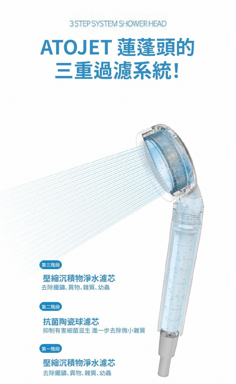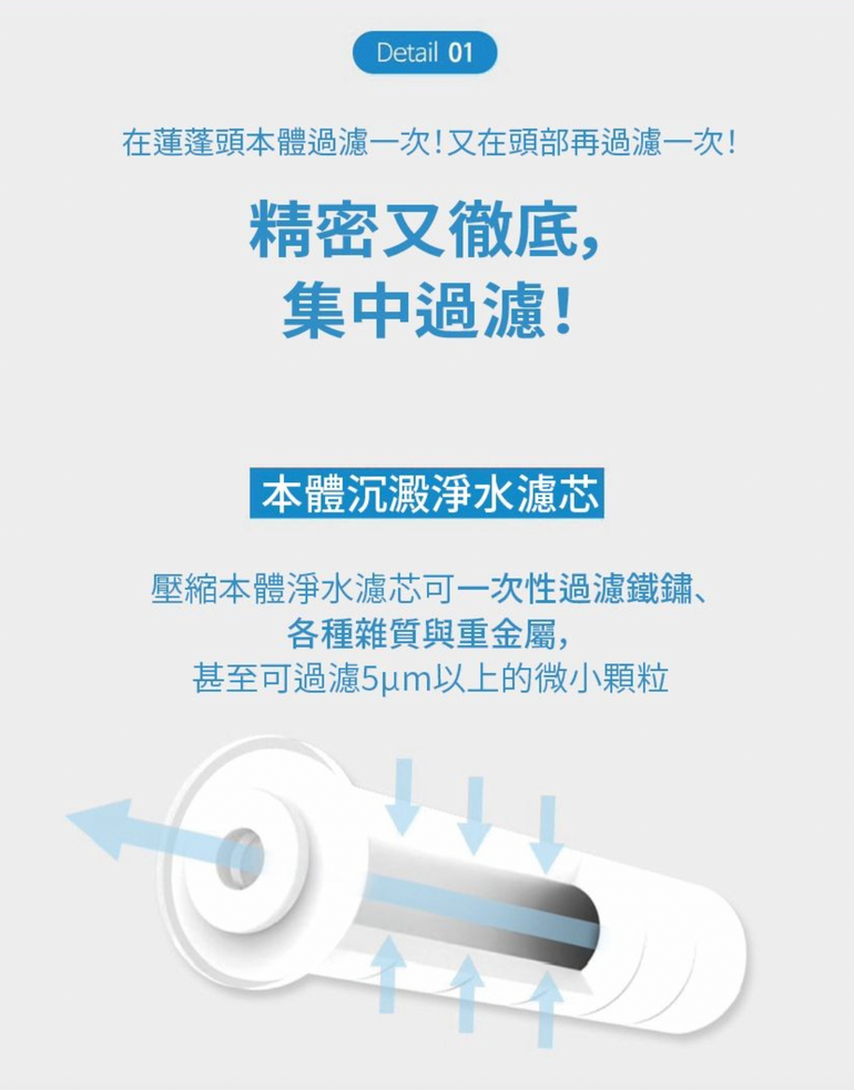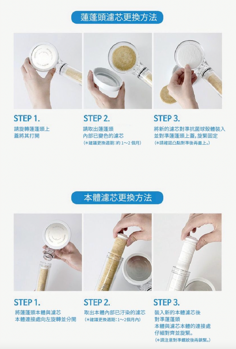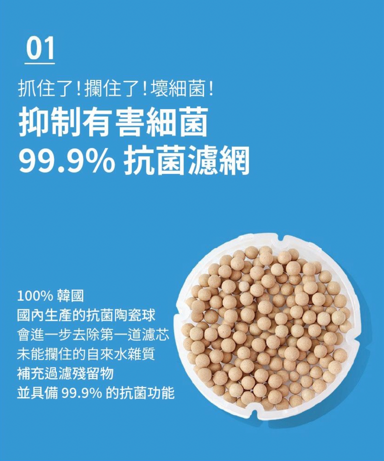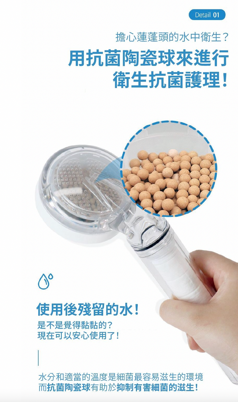 採用多段式過濾系統,能有效過濾自來水中的鐵鏽、雜質和異味,且具有增壓和省水效果。還有抗菌陶瓷球和活性碳濾芯,提供更純淨、安心的沐浴用水。