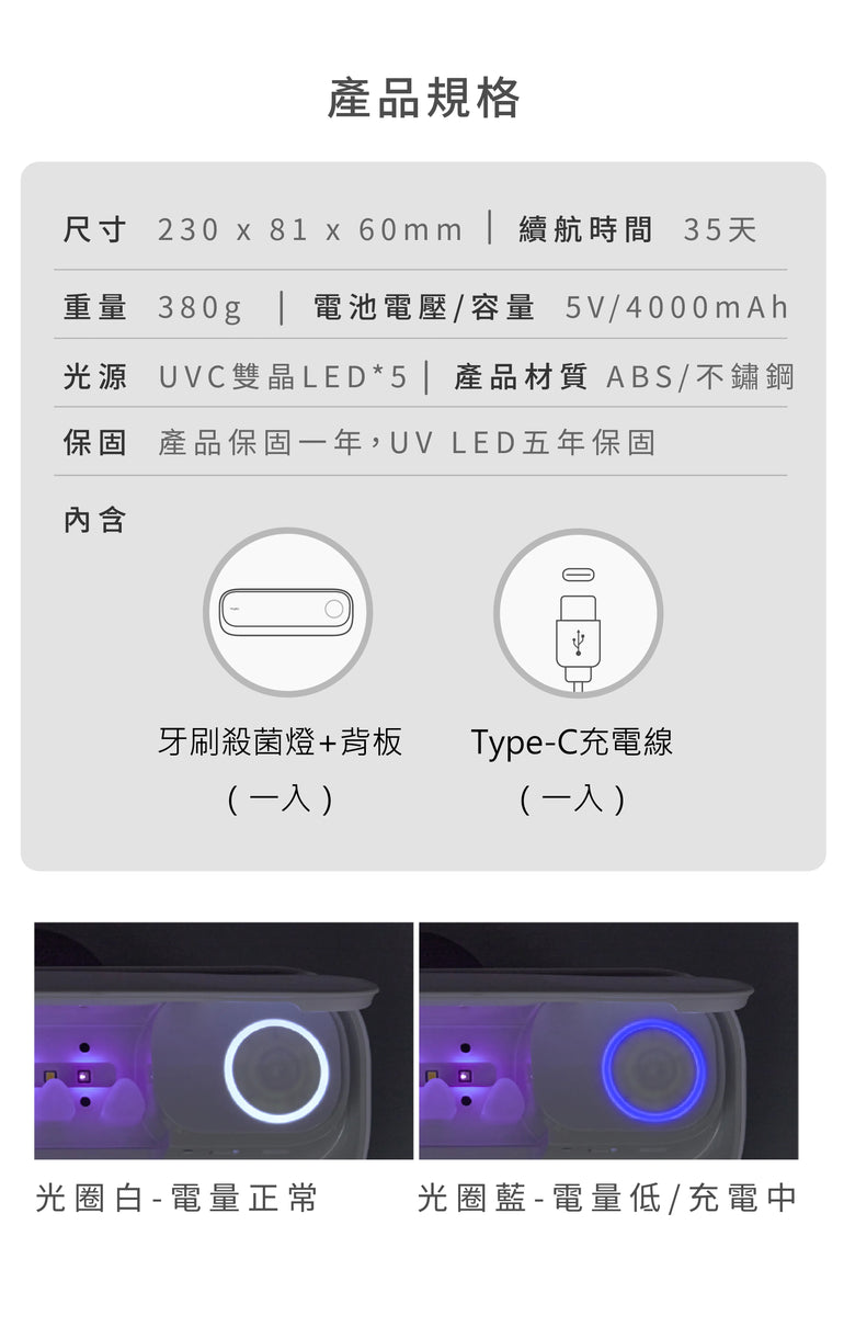 內容物:Light Flo Puré 光韻牙刷殺菌盒、3M背貼板、USB充電線、說明書