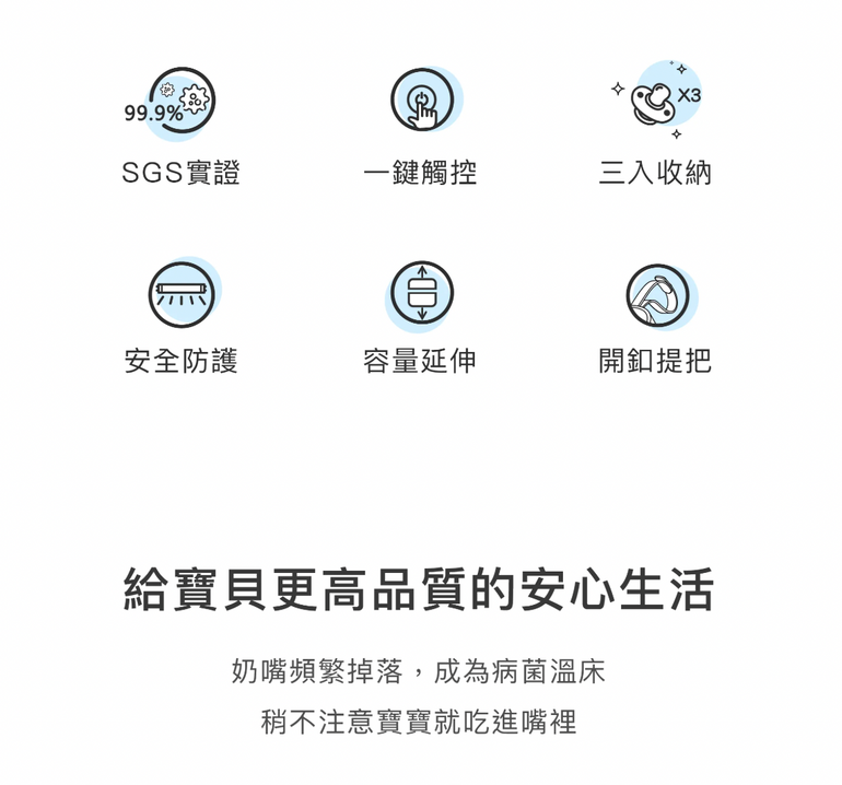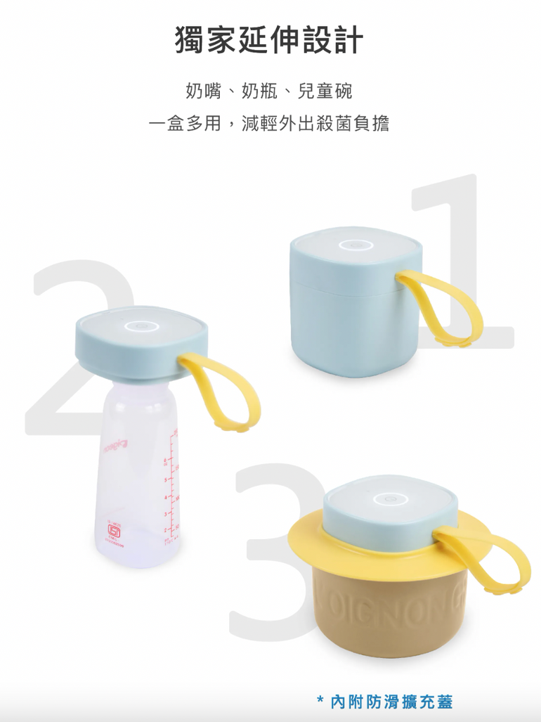 ✓擴充大容量 :3顆奶嘴收納 、奶瓶 、兒童餐具