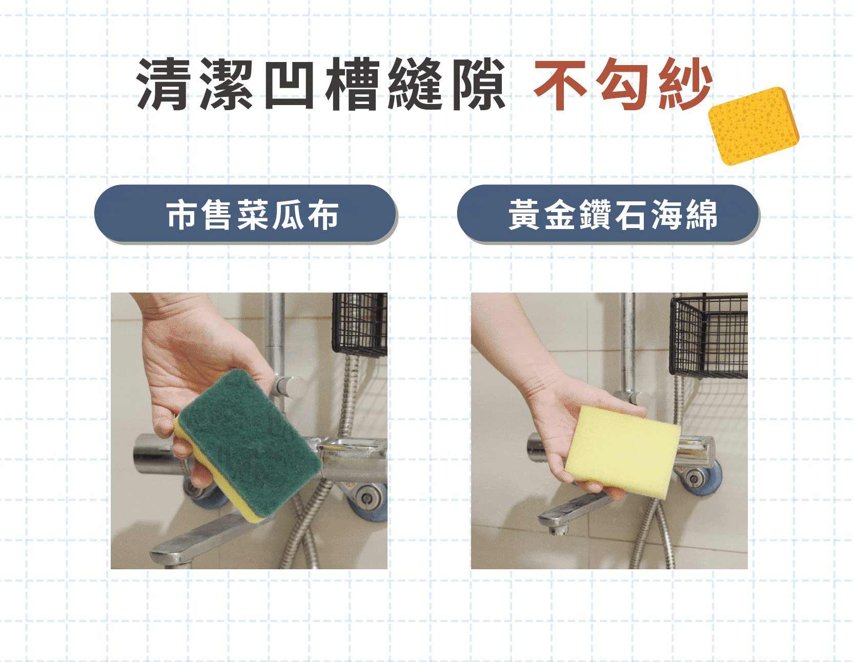沾濕海綿後搭配清潔劑使用,以研磨手法去除油垢、水垢等各種頑垢