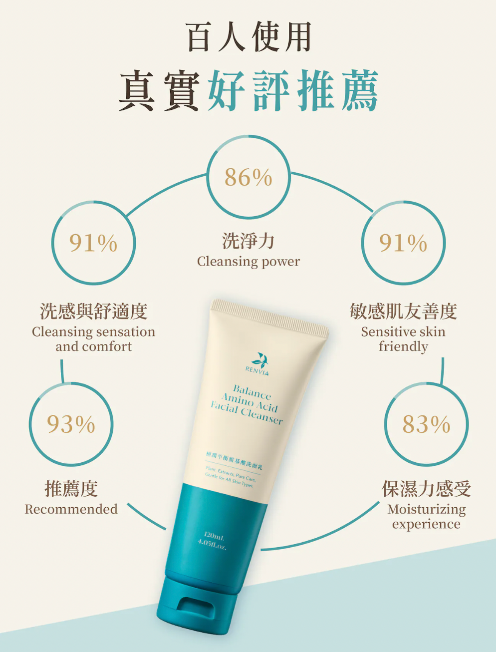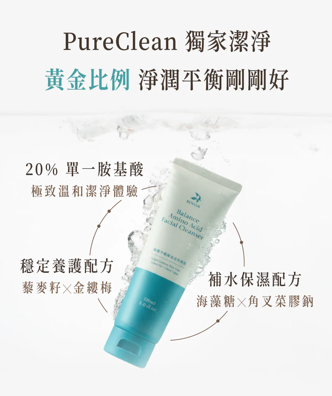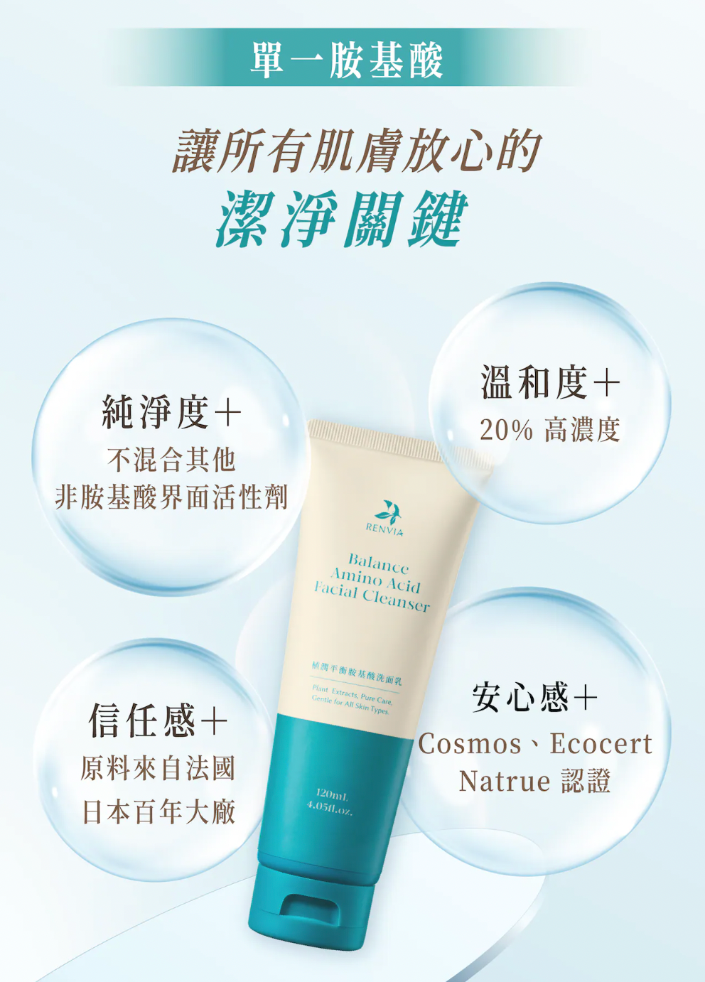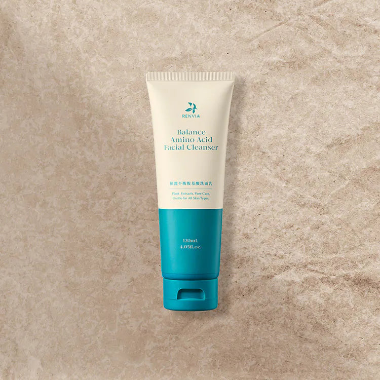 RENVIA 然本植潤平衡胺基酸洗面乳,讓單一胺基酸配方,提供極致溫和的潔淨解方,為你的肌膚留下剛剛好的水潤與安穩。