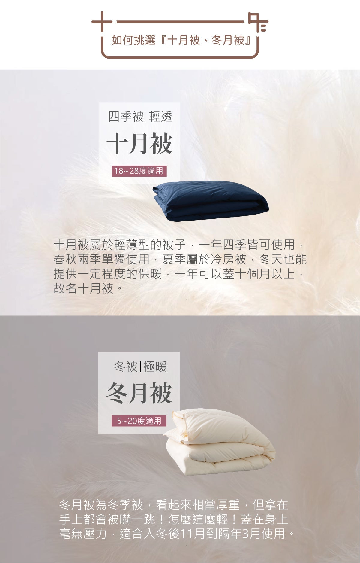 十月被適用於18℃~28℃,春秋兩季蓋起來暖度剛剛好,夏季冷房內使用最舒適。