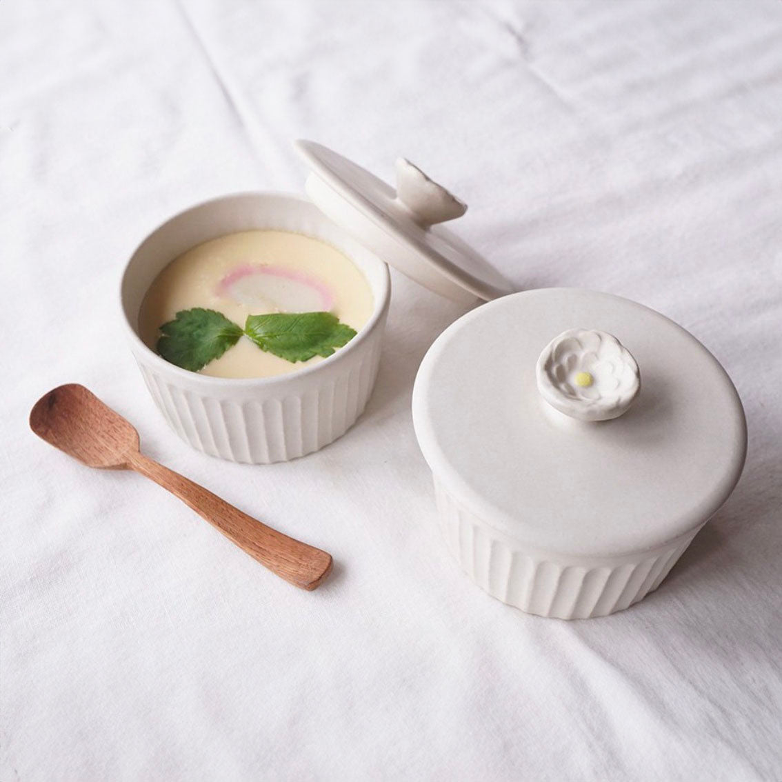 日本益子燒吉澤窯白色花柄蓋茶碗蒸