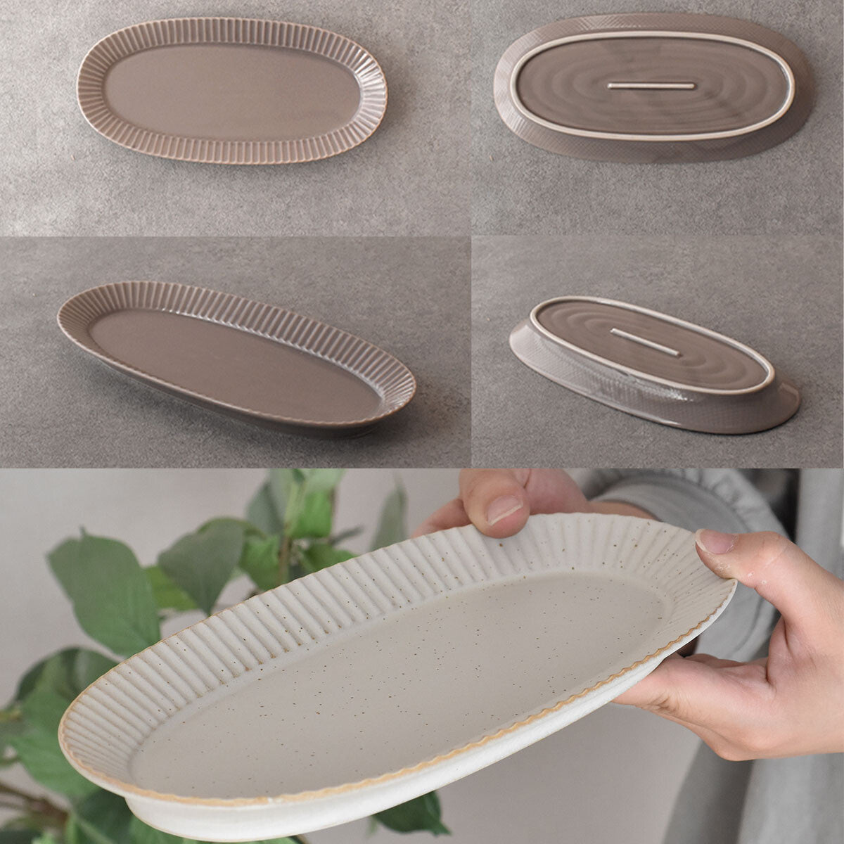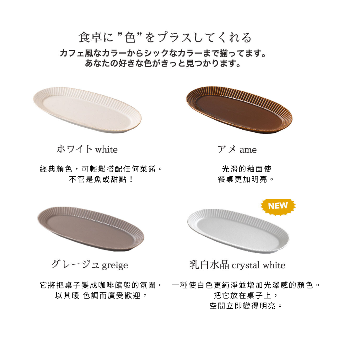 以華麗為靈感的可愛造型扇形盤!背面刻有鑄件獨有的可愛紋路!在淡柔和的色調中,像珍珠一樣閃耀的結晶為其特色!霧面系的釉料呈現出沈穩的色澤!
