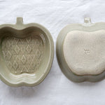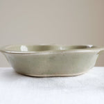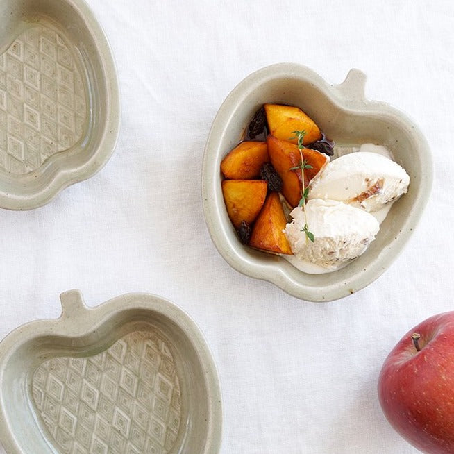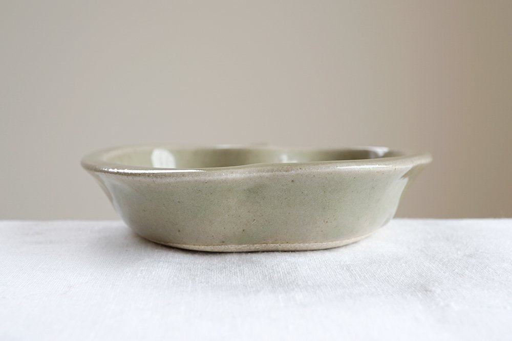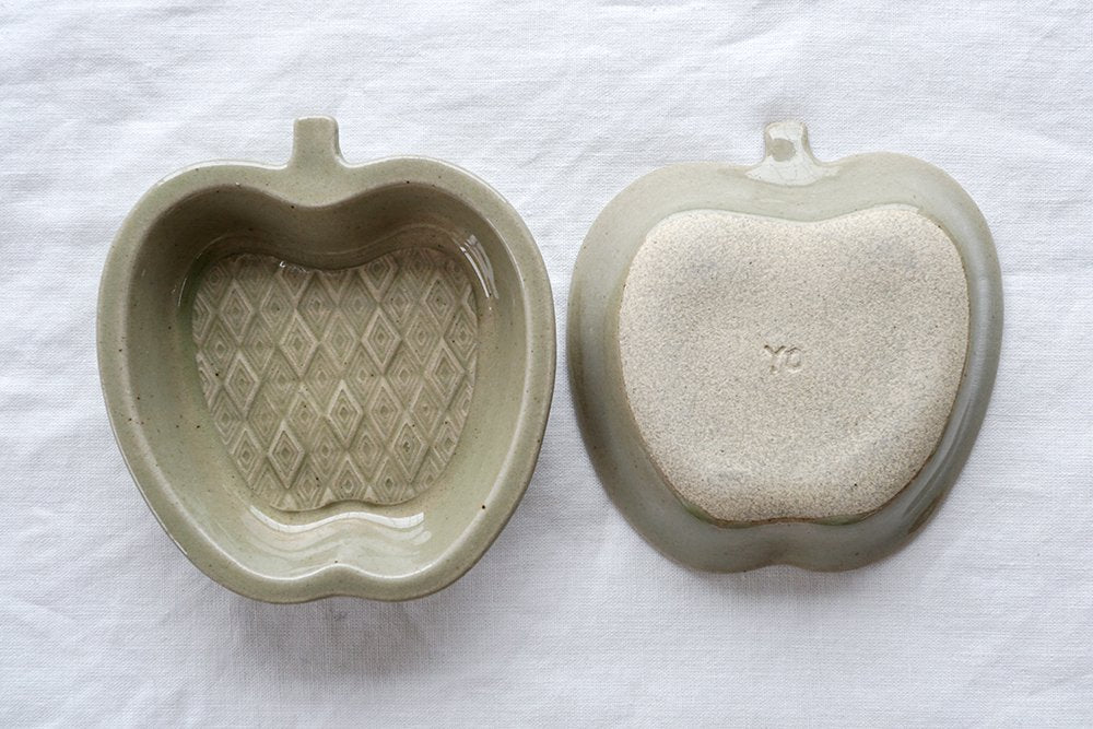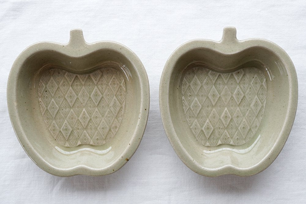 蘋果盤的小尺寸。底部平整部分設計了菱形鑽石花紋,,顏色為珍珠綠。使用了益子燒的釉料,是具有光澤像青蘋果般柔和的翡翠色。