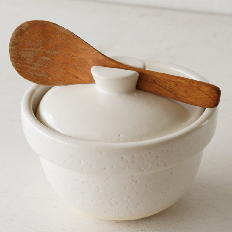重點是沒有手柄的圓形形狀,蓋子上有可以放飯勺的旋鈕。