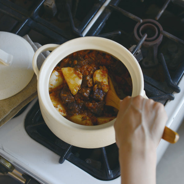 navarin在法文中是燉煮料理的意思。是一款能以稍微窄口的鍋嘴形狀感受到簡單質樸風情的陶鍋。 6號深鍋既可以燉煮料理,也可以用來煮540cc左右的米飯。鍋蓋的設計在燉煮飯料理時不容易因為沸騰打開,能夠深入閉合。