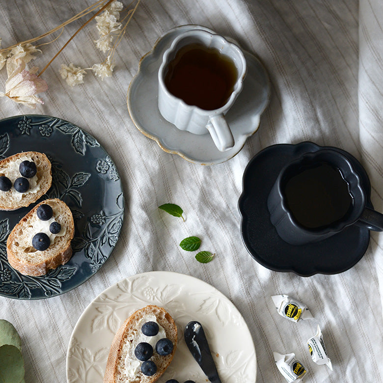 是會想在休息時間使用的杯子、盤子和奶精杯系列。 側面是會聯想到西方建築柱子般的裝飾,為簡單的造型添加了華麗的魅力。有粉引白和釉料黑兩種顏色。兩者都以紅土為基礎,可以感受到器皿的厚重感和深邃感。在遠離忙碌生活的同時用veillée系列享受珍貴的下午茶時光吧!
