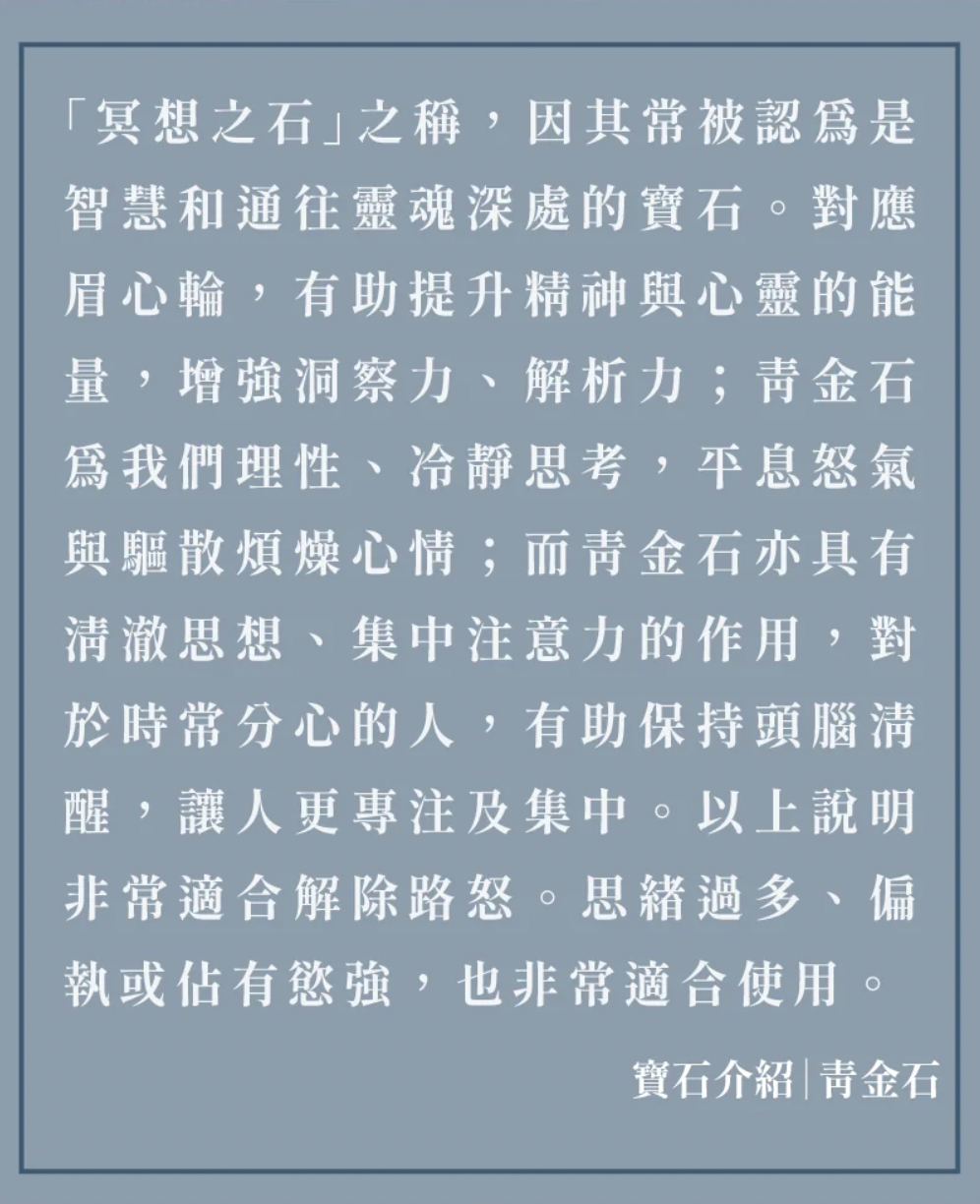 「冥想之石」之稱,因其常被認為是智慧和通往靈魂深處的寶石。對應眉心輪,有助提升精神與心靈的能量,增強洞察力、解析力。青金石為我們理性、冷靜思考,平息努氣與驅散煩躁心情。亦具有清澈思想、集中注意力的作用,對於時常分心的人,有助保持頭腦清醒,讓人更專注及集中。非常適合解除路怒。思緒過多、偏執或佔有慾強,也非常適合使用。