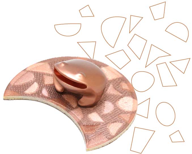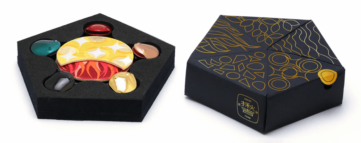 「招財揪吉」的設計,基於傳統的招財蟾蜍,以現代的美學角度簡化,由兩個幾何形:俯瞰的圓與側影的半圓,形成的半球形開始發展,連接太極的曲線,用一條連續的轉角線,貫穿超跑般的流線曲面,形成簡約對稱、富有傳統韻味又充滿有機生命的造形。把蟾蜍原本的生物造型簡化到有靈性的感覺,並融合如意、聚寶、招財的意象,經過無數次修改調整,讓每一個流線曲面都發出光芒。