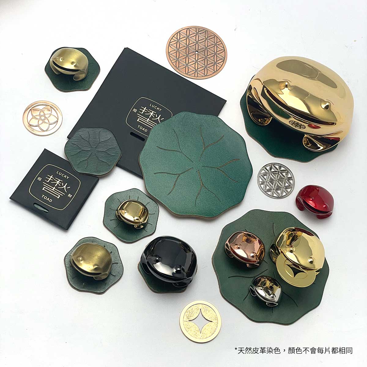為呈現荷葉自然綠意感覺,特別用義大利進口植鞣牛皮,特殊半油蠟封皮面,低溫烙印出荷葉葉脈,招財揪吉在荷葉上增添靈氣。*不包含揪吉