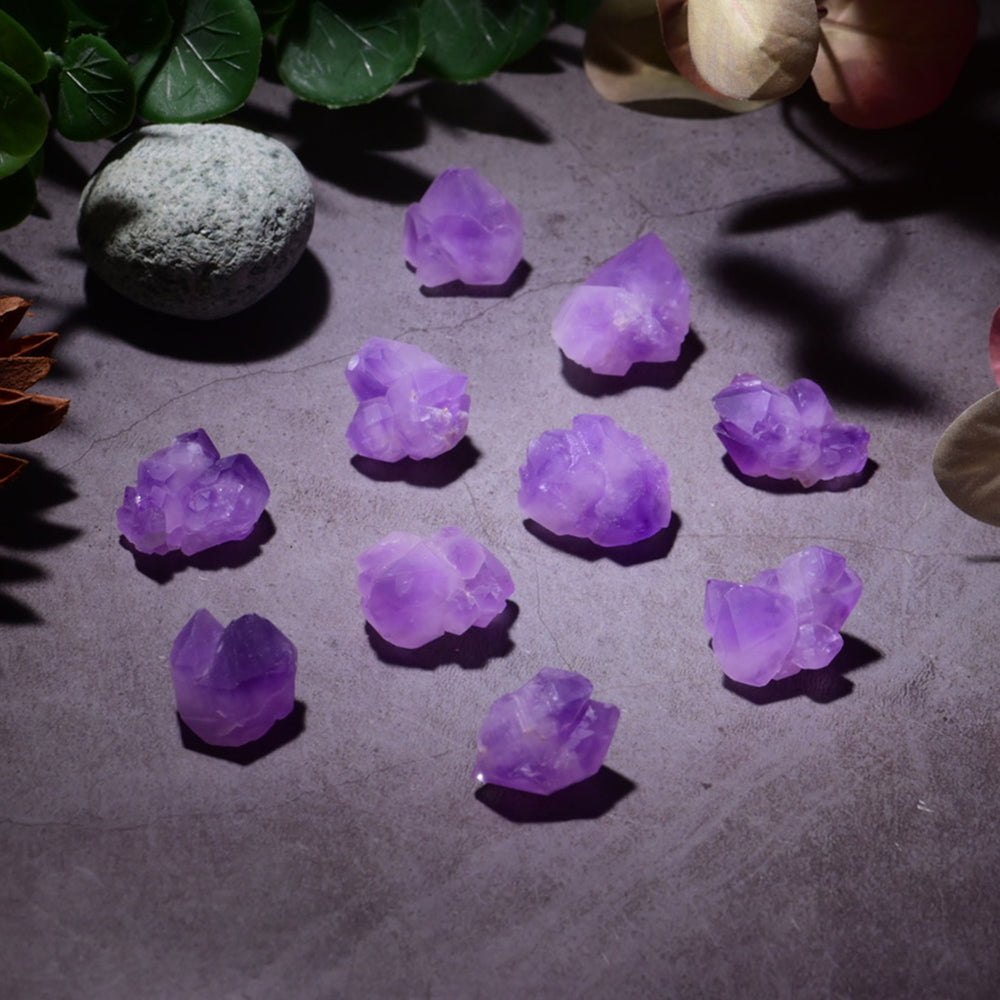一簇簇的紫水晶,晶柱表面帶著原生生長紋路,天然原礦未經過拋光處理。