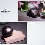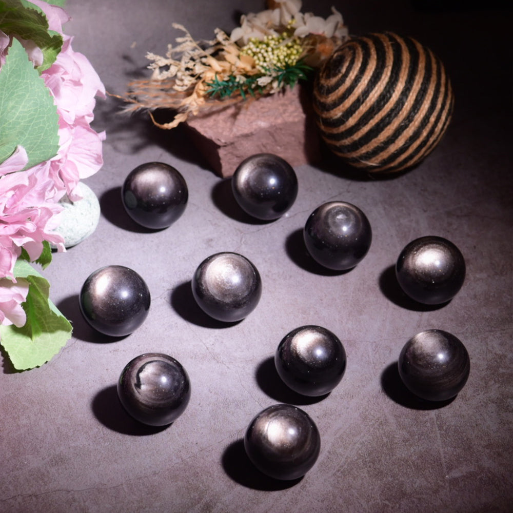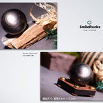 此商品為黑曜石中的銀曜石球,黑色晶體帶銀色光澤,折射閃耀。
