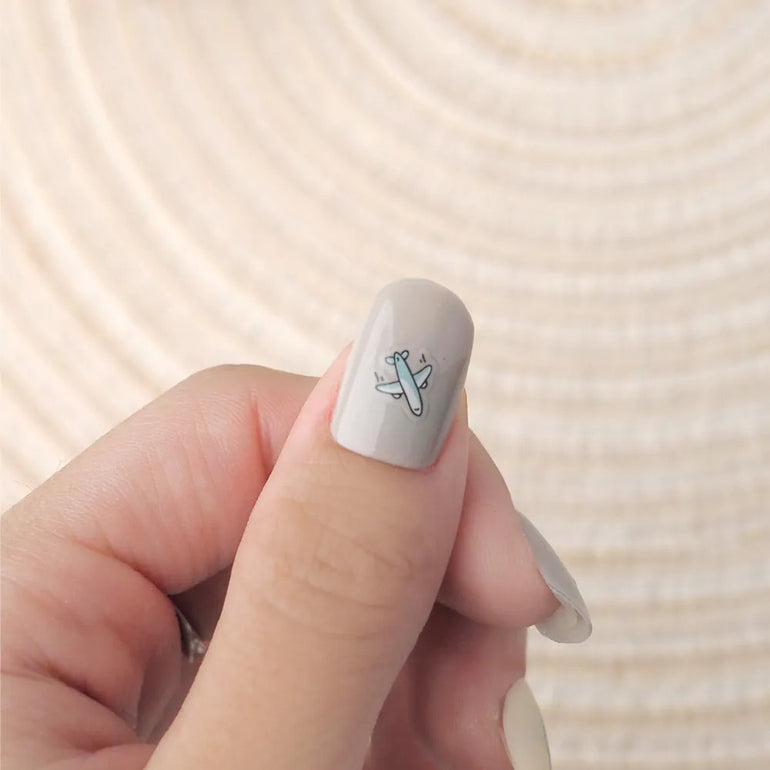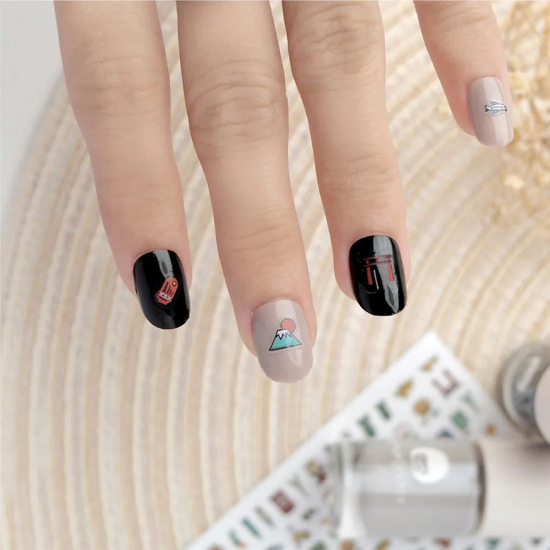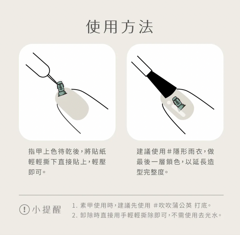 ●指甲油上色待乾後,將貼紙直接貼上,輕壓後使用"隱形雨衣(外層護色指甲油)"做最後一層鎖色,延長造型持久度。