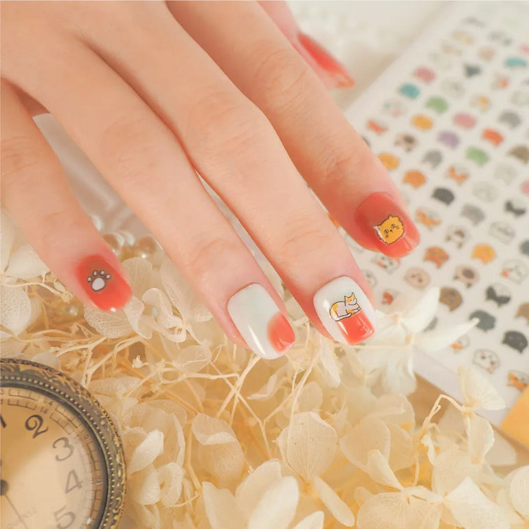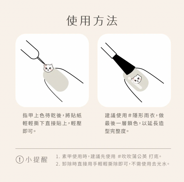 ●指甲油上色待乾後,將貼紙直接貼上,輕壓後使用"隱形雨衣(外層護色指甲油)"做最後一層鎖色,延長造型持久度。