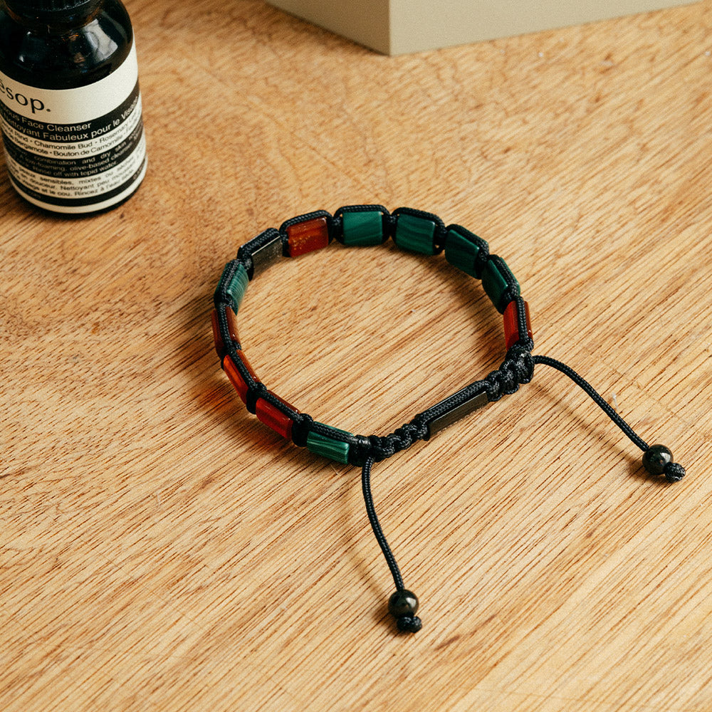 紅瑪瑙的豔麗紅色和孔雀石的綠色光澤。紅瑪瑙帶有熱情和活力的能量,而孔雀石則以其獨特的綠色和藍色斑紋而聞名。這種組合營造出一種瑰麗和熱情的氛圍。