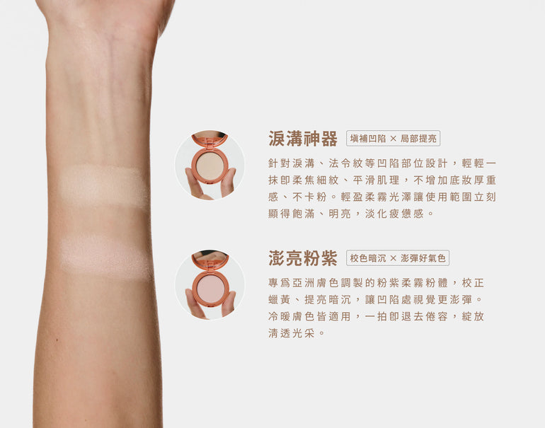 專為亞洲膚色調製的粉紫柔霧粉體,校正蠟黃、提亮暗沉,讓凹陷處視覺更澎彈。冷暖膚色皆適用,一拍即退去倦容,綻放清透光采。