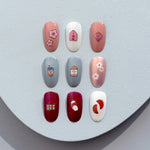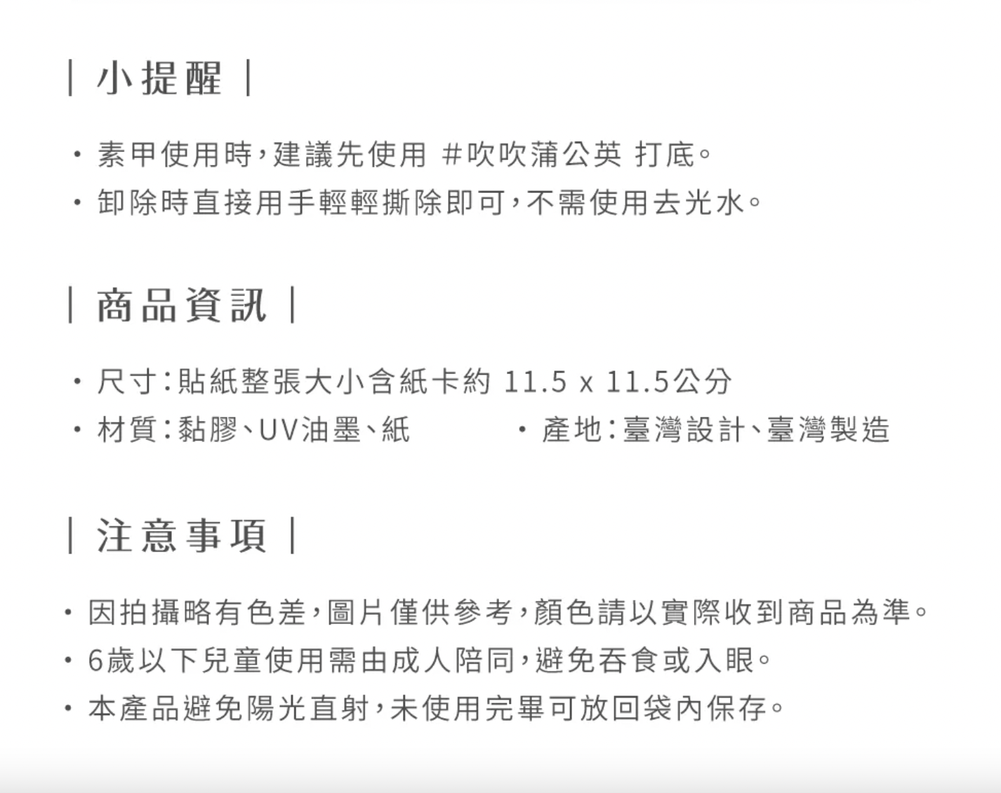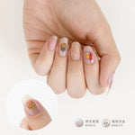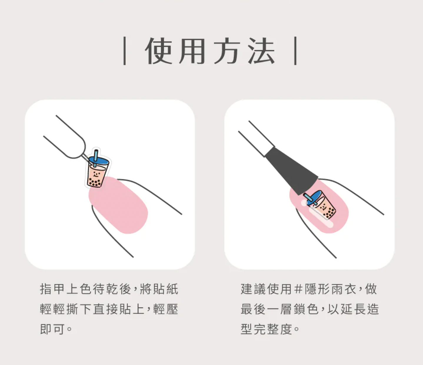 ●指甲油上色待乾後,將貼紙直接貼上,輕壓後使用"隱形雨衣(外層護色指甲油)"做最後一層鎖色,延長造型持久度。