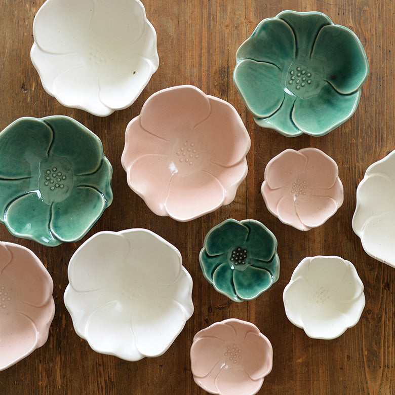盛開在寒冷而清澈空氣中,端莊又美麗的山茶花。4寸的小碗透過接近實際花朵的形狀來呈現花朵的可愛。 可以用來放小菜或是漬物,也可以用來放冰淇淋、優格等當作甜點杯來使用。 2.5寸的小尺寸推薦可以放置各種不同口味的果醬、黑豆和調味料等,好幾個擺盤在一個大盤上也很讚。 每天日常用餐時光和有特別慶祝活時都可以來拿使用的器皿。用桌上盛開的山茶花感受即將到來的秋冬吧。