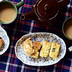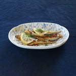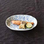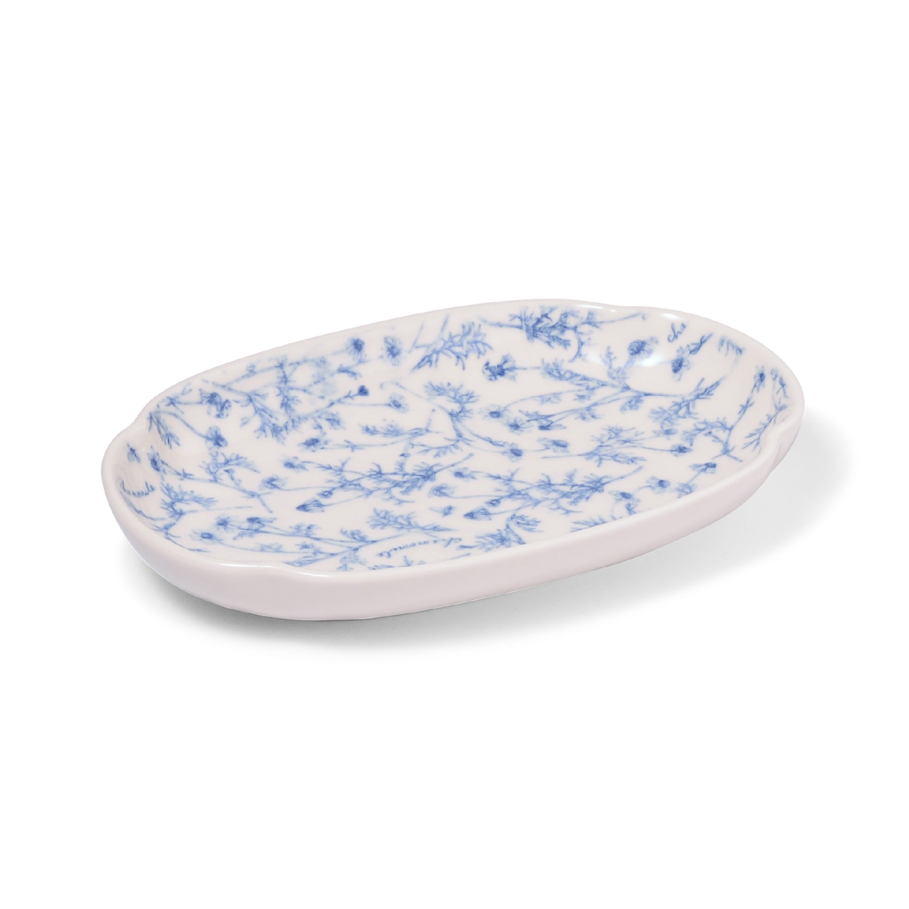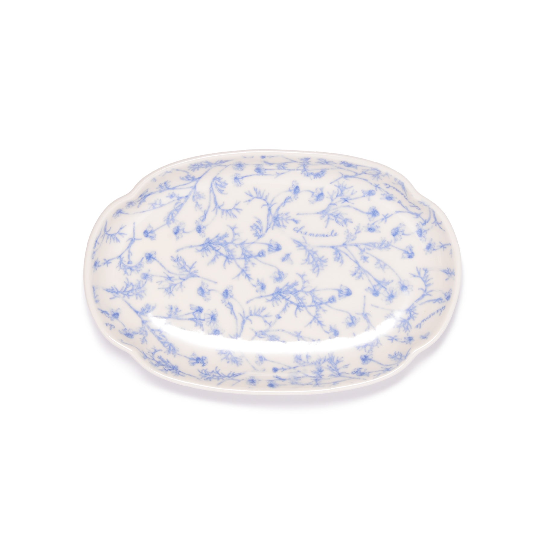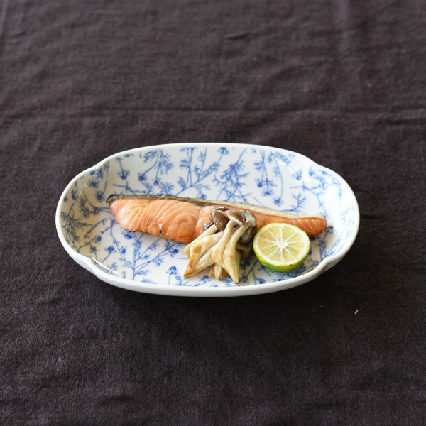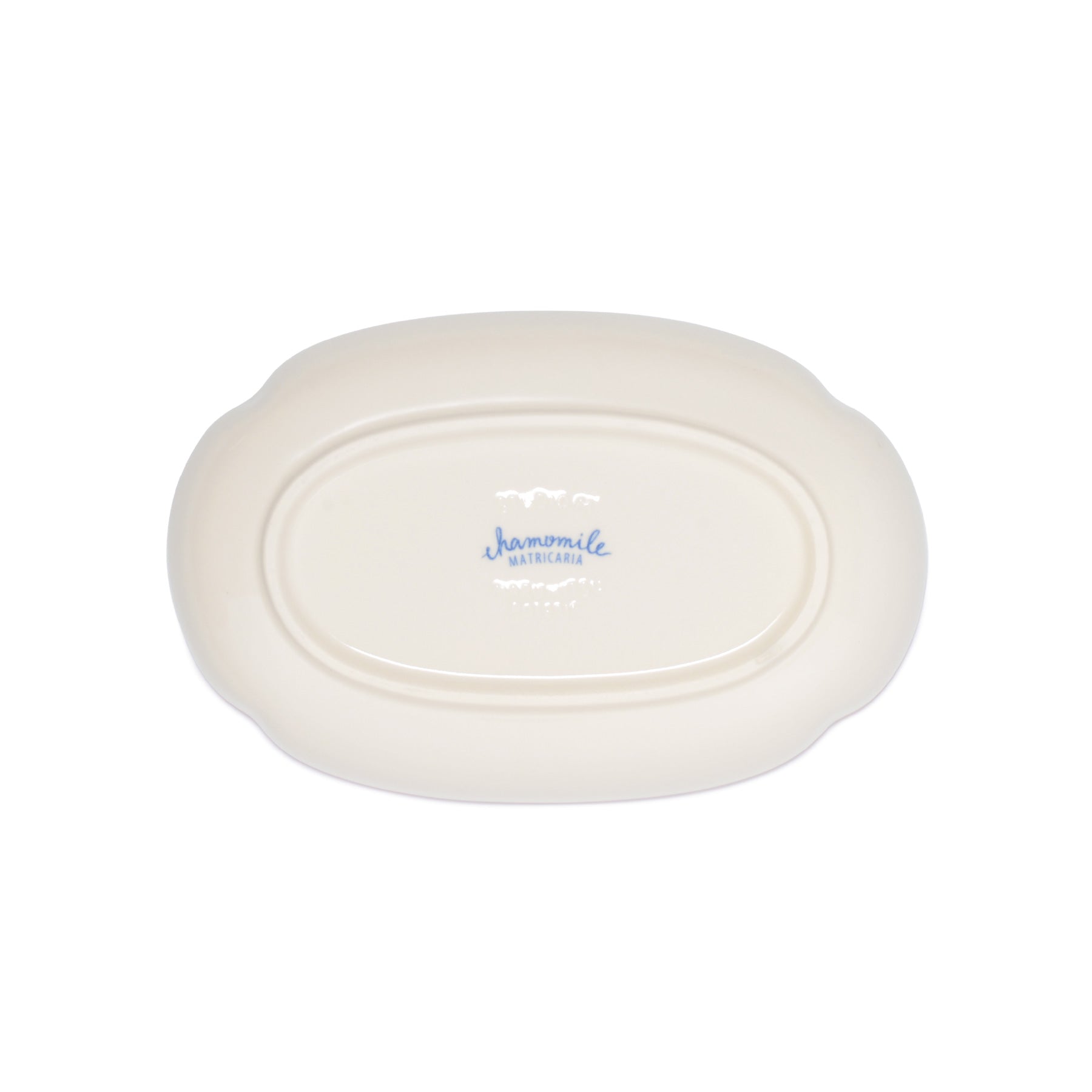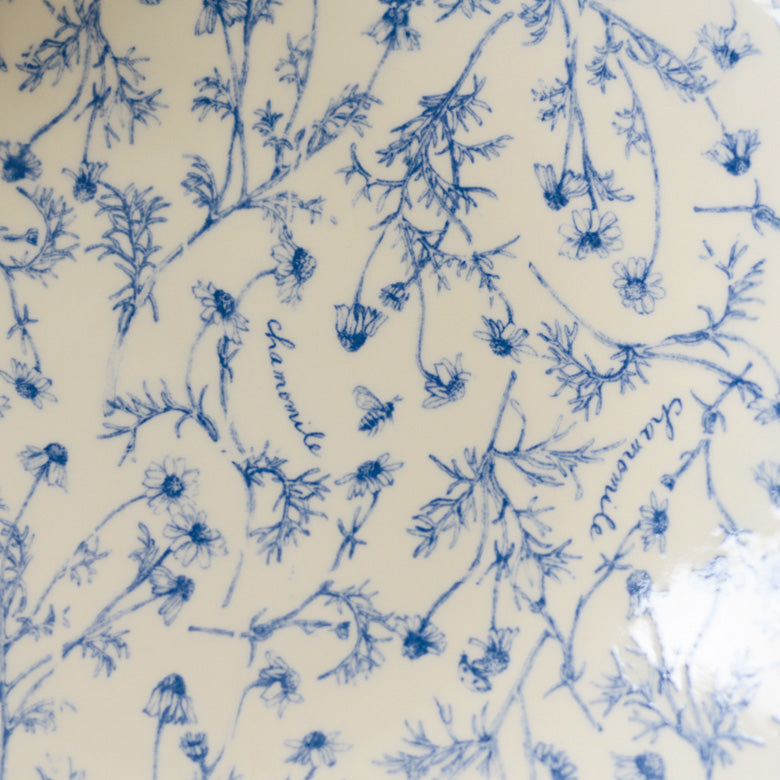 一片盛開的洋甘菊在晴天很可愛,走近時被一股甜美的香味包圍,可以感受到芬芳的氣味和毛茸茸田野的歡樂。反复勾畫洋甘菊,把圖片組合起來做成了圖案,以「銅板轉印」的技術將設計轉印到容器表面,將銅板紙貼到彎曲容器的整個內部需要高水平的技能。一張一張手工粘貼的圖案,雖然有模糊,有些圖片連不上,粘貼過程中自然產生的圖案濃淡和塗抹的不均勻,深具品味。意想不到富有表現力的洋甘菊誕生了,仔細看圖還可以看到田野周圍忙著飛來飛去的昆蟲。煎茄子、酸菜魚等稍長的食材推薦使用推薦橢圓盤。