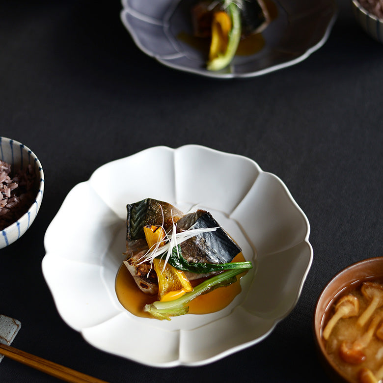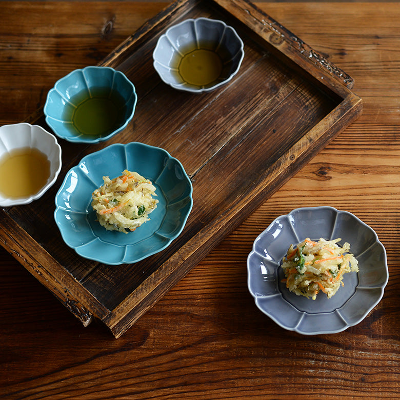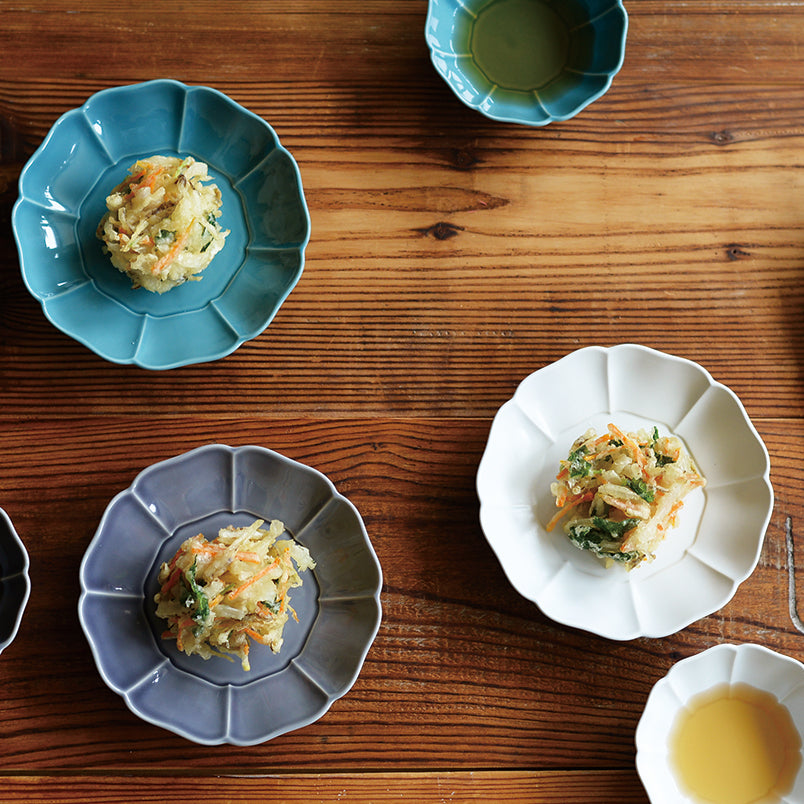 大氣高雅的花型器皿。此系列具有令人印象深刻的俐落形狀和精緻色彩。花瓣的角度從中間向上略有變化,可以藉此感受到器皿包住食物的柔軟圓潤。7寸盤適合作為水煮魚等主菜、5寸盤非常好用,會讓人想要一次擁有好幾個、3.5寸碗的大小剛好可以用來裝漬物或一人份的小菜,當作甜點盤也很適合。
