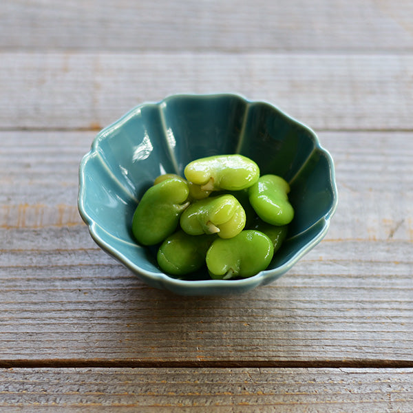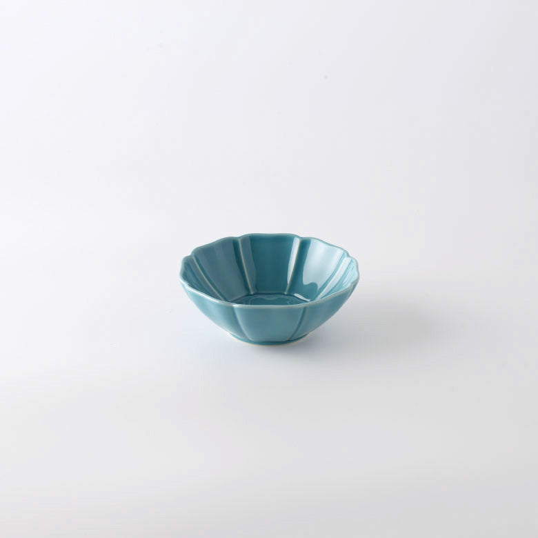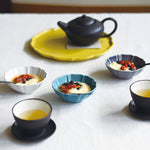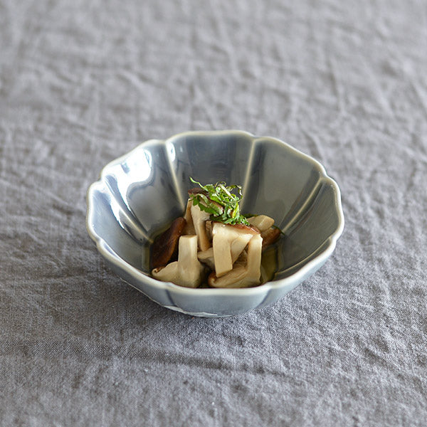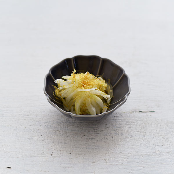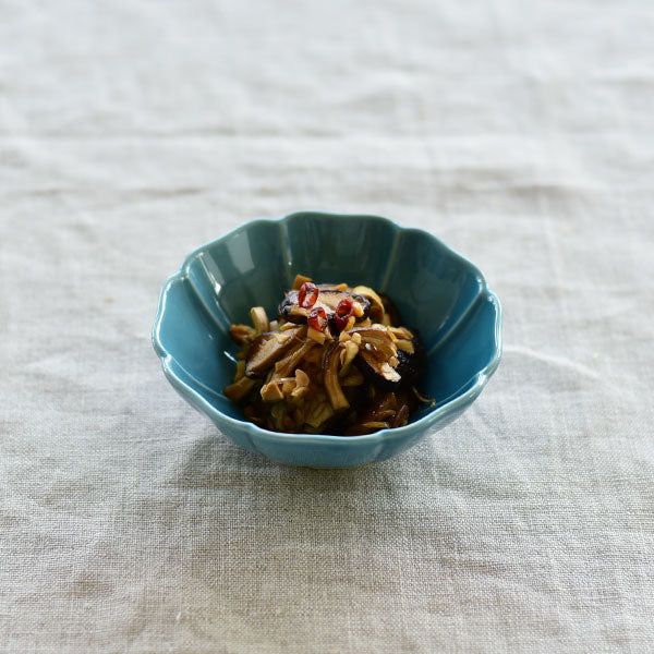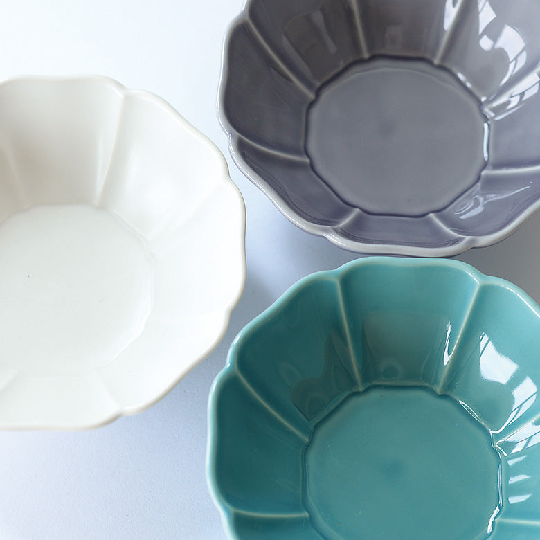 大氣高雅的花型器皿。此系列具有令人印象深刻的俐落形狀和精緻色彩。花瓣的角度從中間向上略有變化,可以藉此感受到器皿包住食物的柔軟圓潤。7寸盤適合作為水煮魚等主菜、5寸盤非常好用,會讓人想要一次擁有好幾個、3.5寸碗的大小剛好可以用來裝漬物或一人份的小菜,當作甜點盤也很適合。