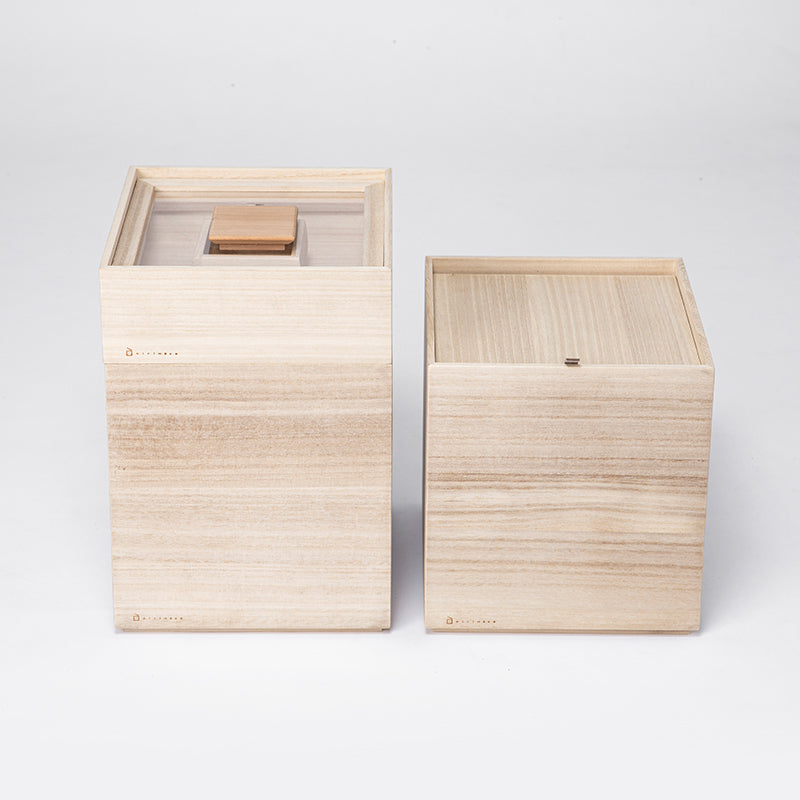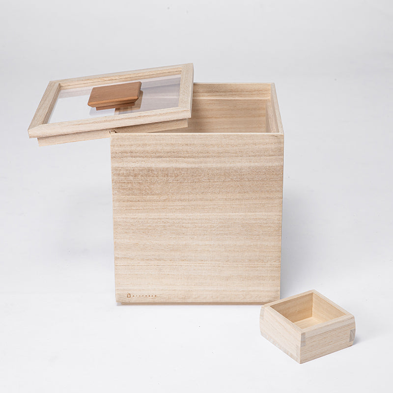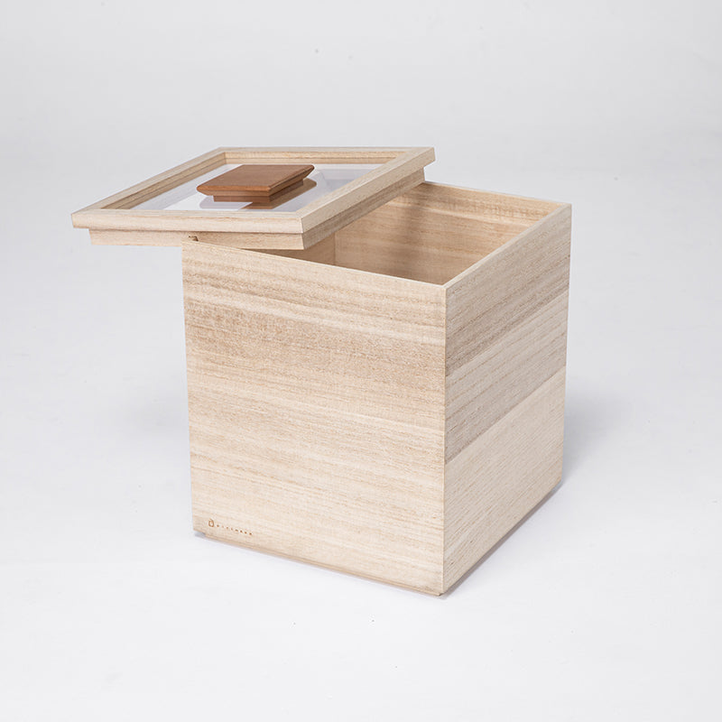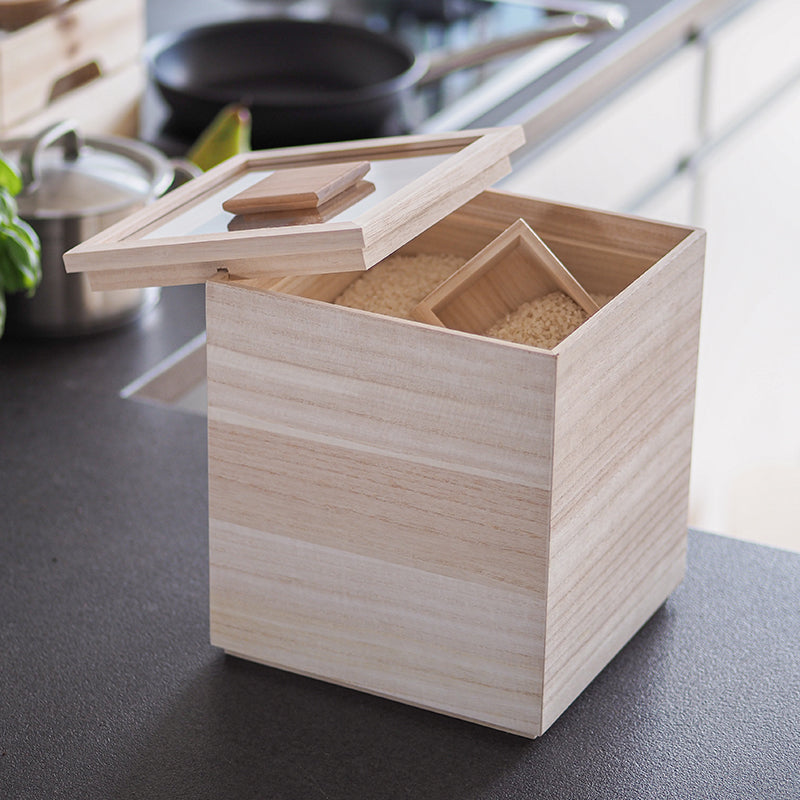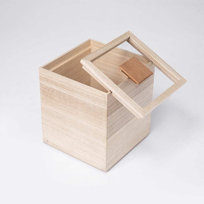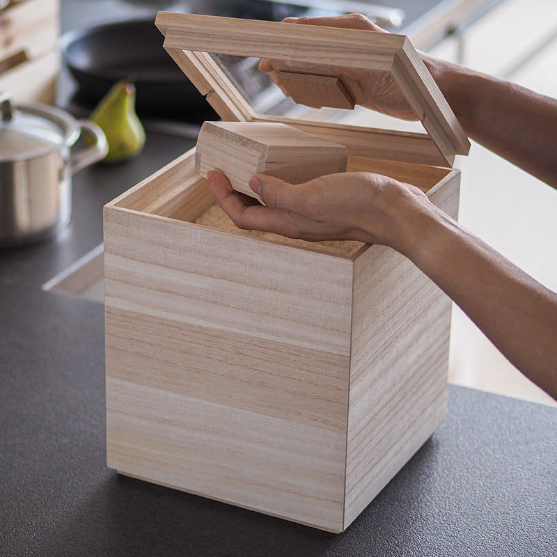 米箱能完整保存米粒原有的鮮度。為了便於觀察內容物而採用透明的上蓋,結合傳統桐木箱的「四方棧」技法,不但具有良好的氣密性,就算箱子傾倒也不易脫落。
