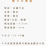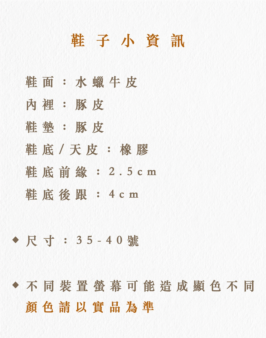 註:每雙鞋款皆為手工訂製,恕不退換,下單前請參考尺寸說明、試穿報告選擇適合尺寸。一般商品訂製時間為45天。如遇假期,將順延出貨日。