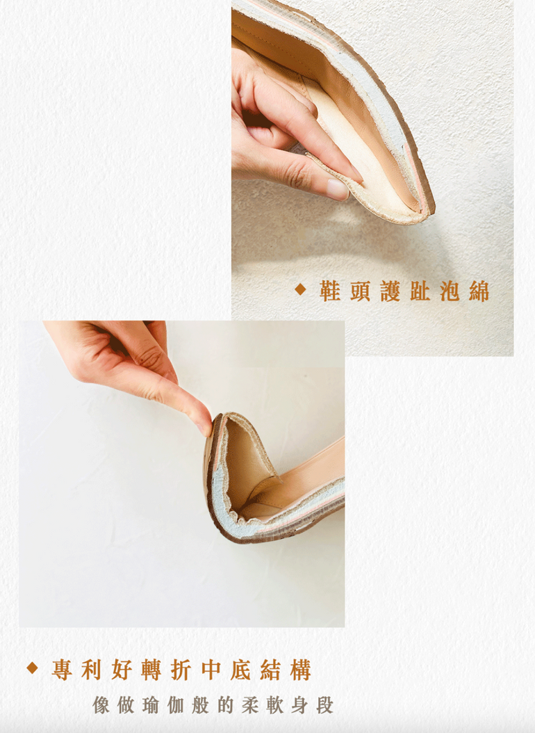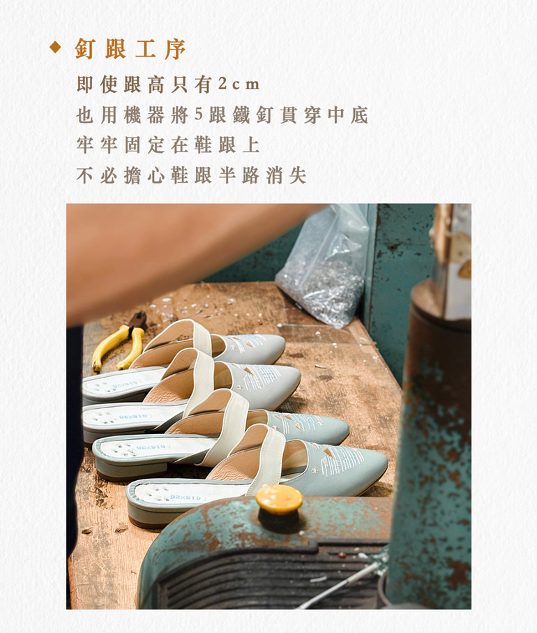 ・釘跟工序即使跟高只有 2cm 也用機器將 5 跟鐵釘貫穿中底,牢牢固定在鞋跟上,不必擔心鞋跟半路消失。