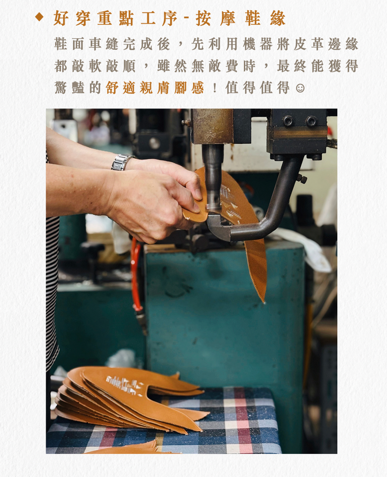 ・好穿重點工序 - 按摩鞋緣。鞋面車縫完成後,先利用機器將皮格邊緣都敲軟敲順,雖然無敵費時,最終能獲得驚豔的舒適親膚腳感!值得值得。