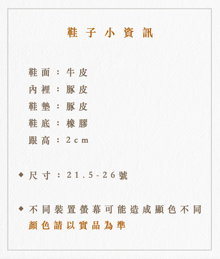 註:每雙鞋款皆為手工訂製,恕不退換,下單前請參考尺寸說明、試穿報告選擇適合尺寸。一般商品訂製時間為75天。如遇假期,將順延出貨日。