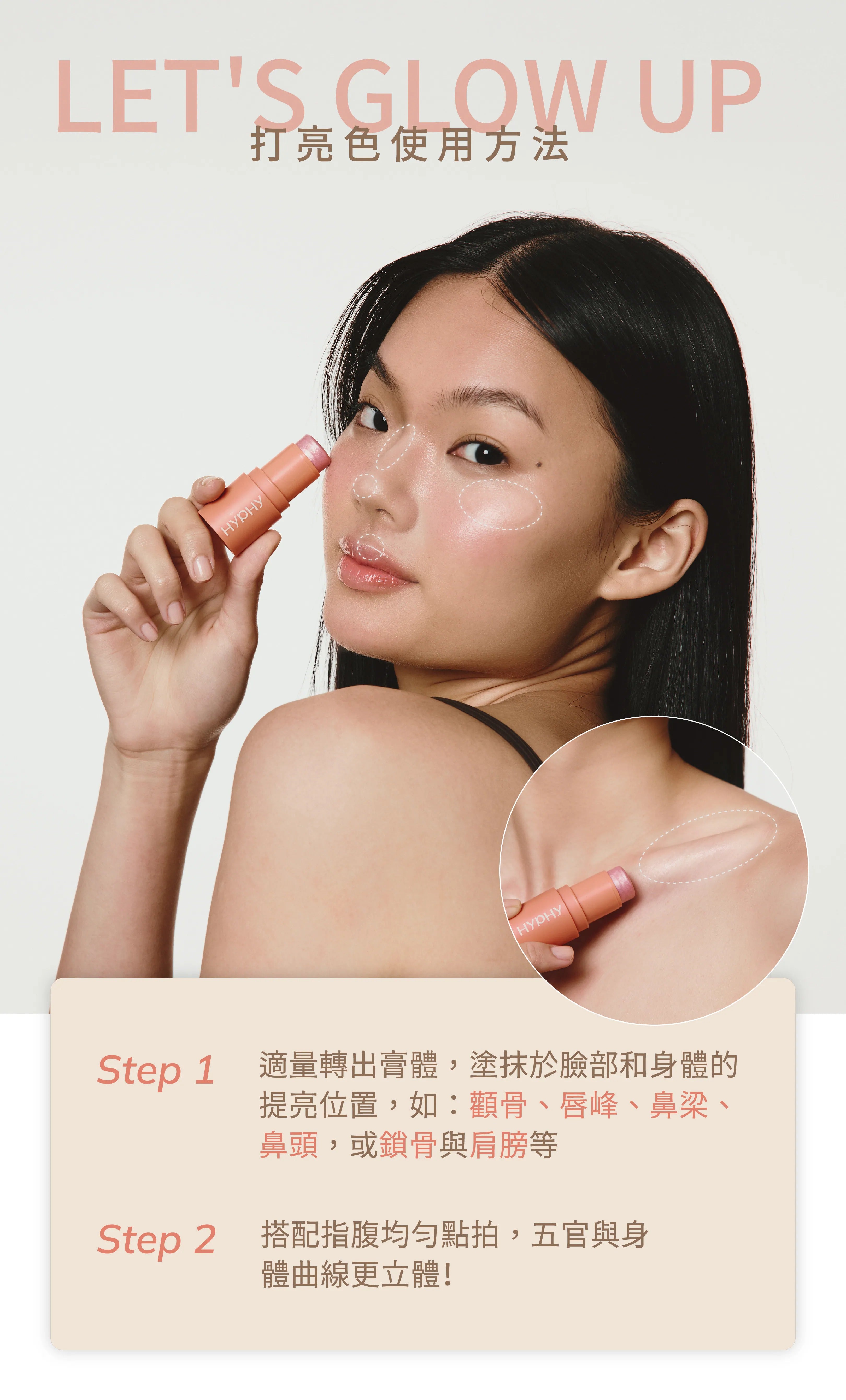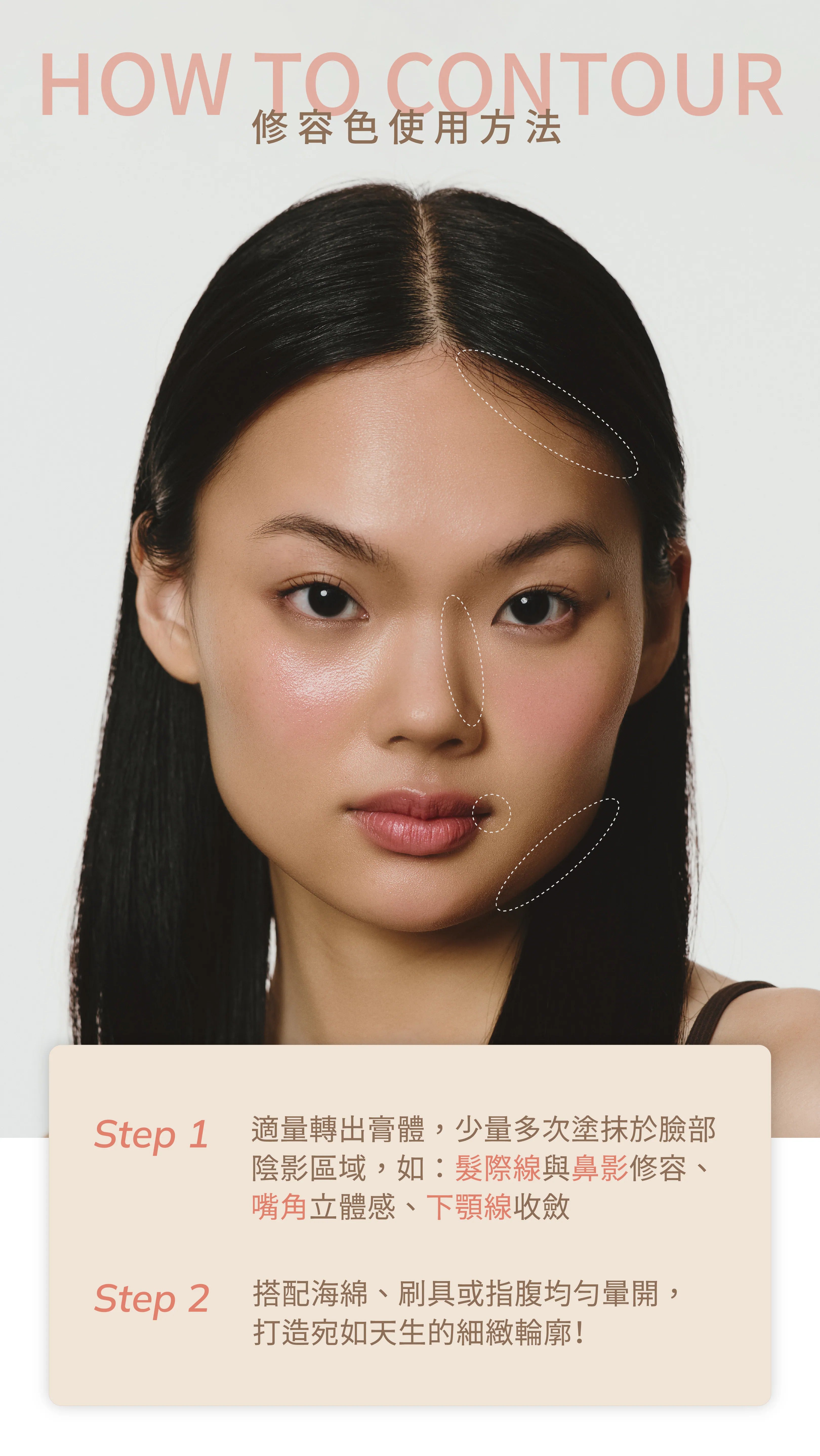 「粉紅糖霜」或「摩卡慕斯」色號,建議適量塗抹於希望修飾的臉部區塊,提亮或修飾輪廓。
