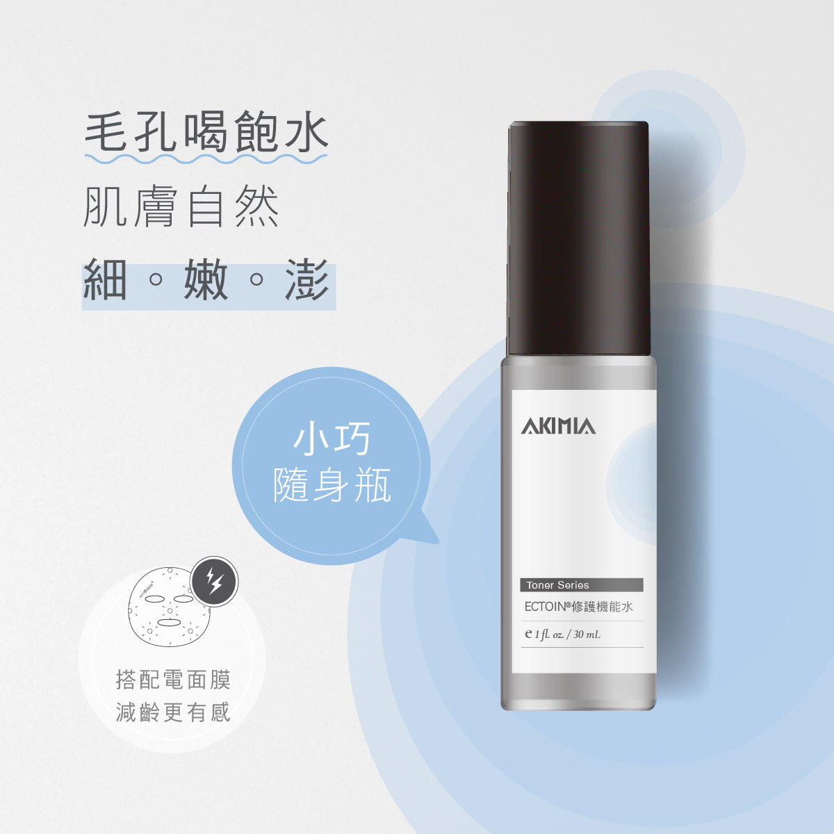 AKIMIA推薦每週三次,於潔顏後,全臉塗抹/噴霧,再搭配微電流面膜敷用,達到深層滲透、加倍功效的修護保養!