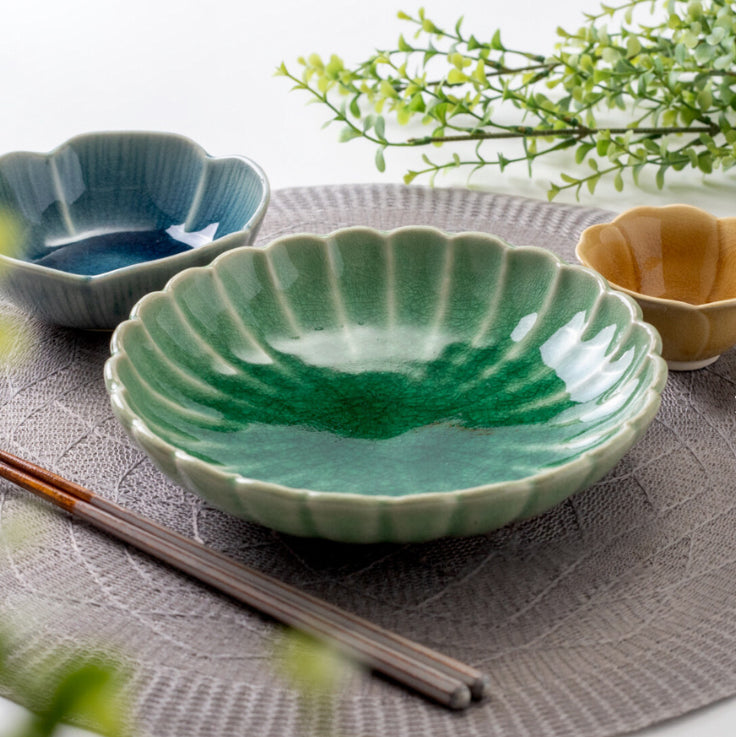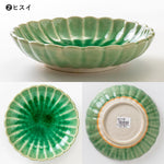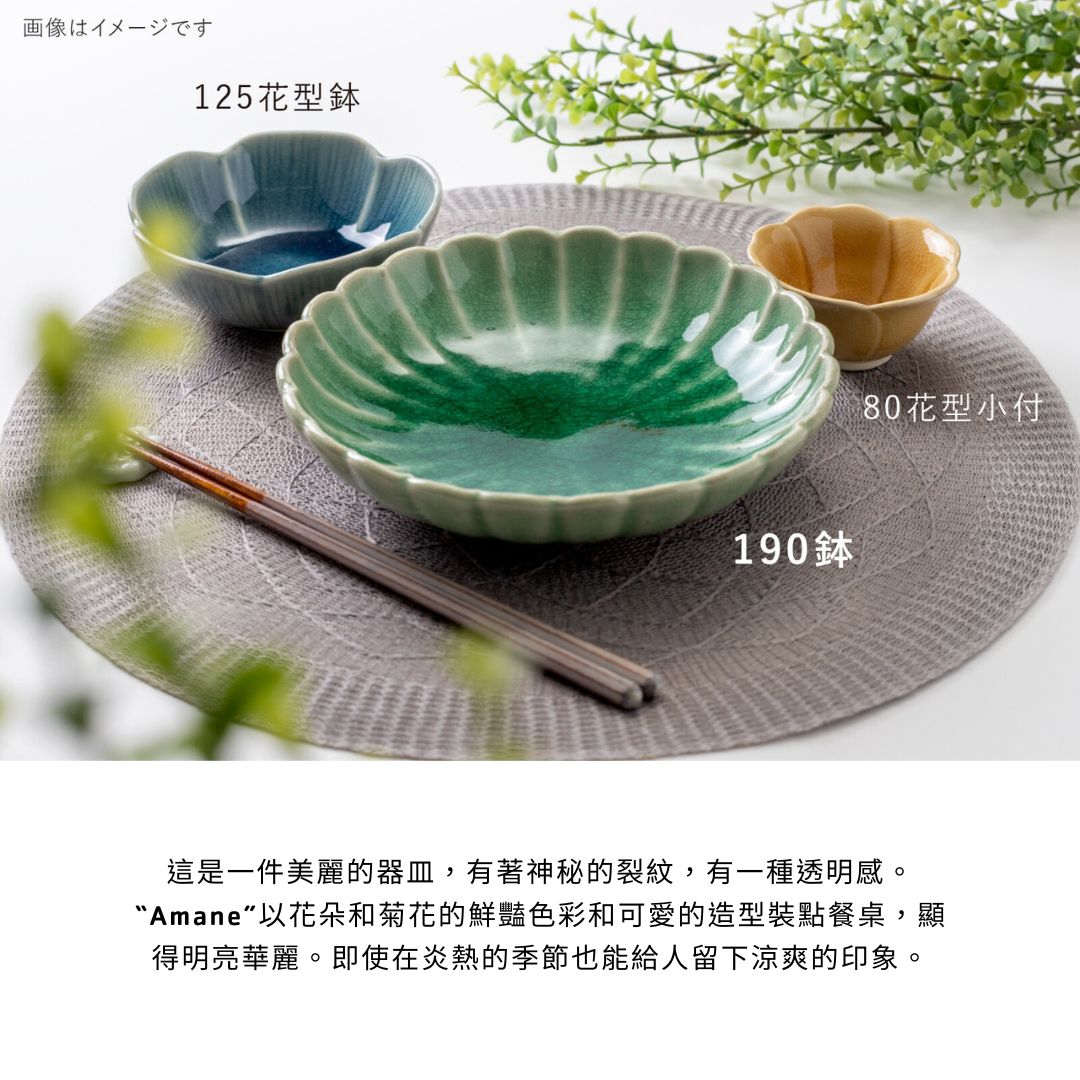 為餐桌增添鮮豔色彩,並使其看起來明亮華麗的「amane」圓形花碗。滲透紋路所產生的裂紋圖案非常神秘,感覺會替餐桌上帶來清爽感,是非常適合炎熱季節的系列。
