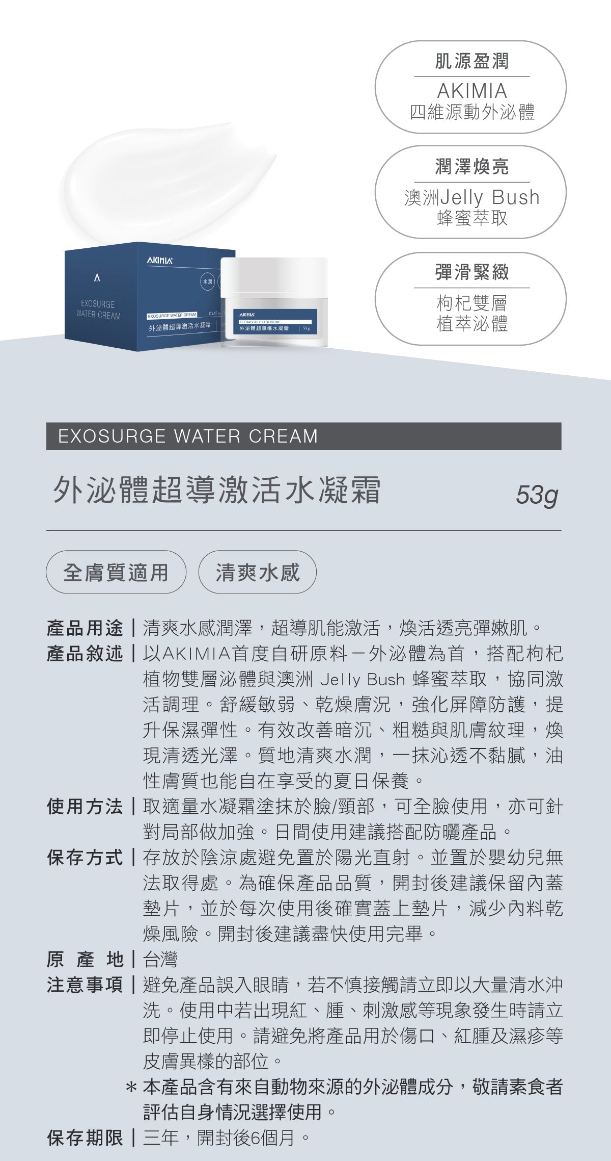 以AKIMIA首度自研原料-外泌體為首,搭配枸杞植物雙層外泌體與澳洲 Jelly Bush 蜂蜜萃取,協同激活調理。舒緩敏弱、乾燥膚況,強化屏障防護,提升保濕彈性。有效改善暗沉、粗糙與肌膚紋理,煥現清透光澤。質地清爽水潤,一抹沁透不黏膩,油性膚質也能自在享受的夏日保養。
