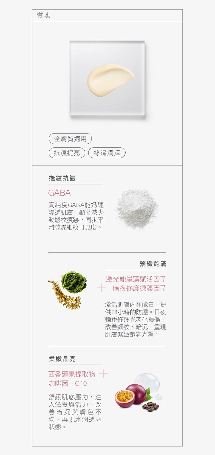 *因GABA原料成分的天然特性,使用時肌膚會出現短暫的麻/刺/癢感受,此為正常現象,敬請安心使用。
