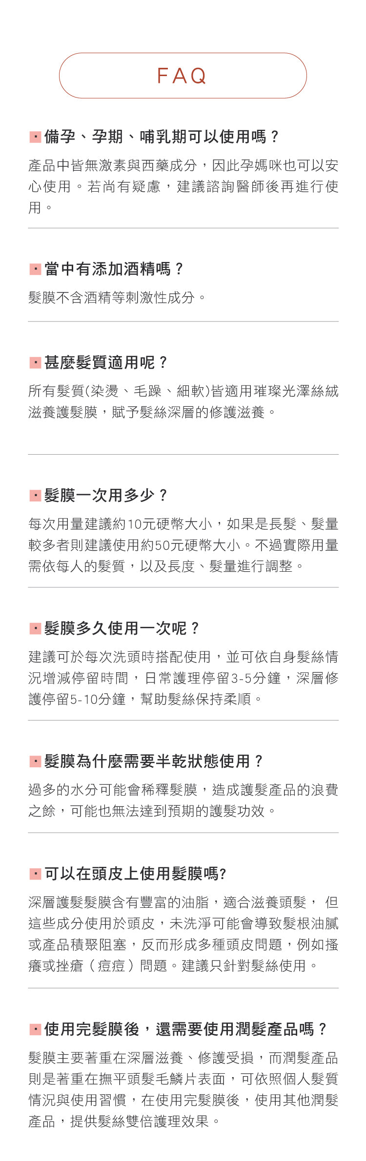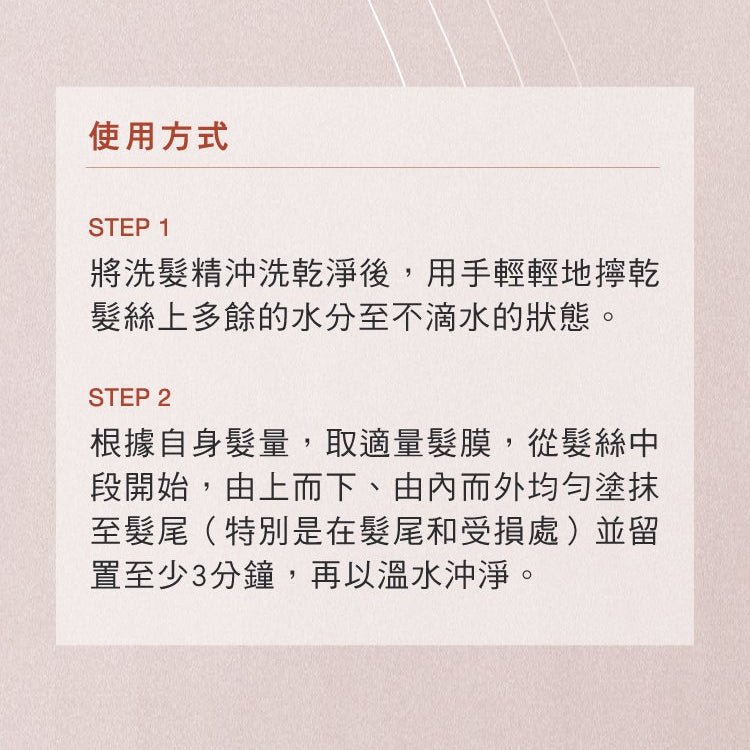 使用方法| 洗淨頭髮後,壓出多餘水分,將髮膜塗抹於髮絲中段至髮尾,留置至少3分鐘,再以溫水沖淨。