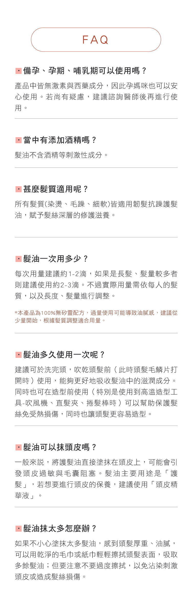 *本產品為100%無矽靈配方,過量使用可能導致油膩感,建議從少量開始,根據髮質調整適合用量。