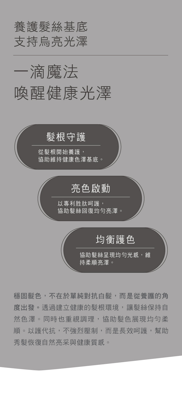 精選三種活性成分,提供髮根深層滋養,為秀髮提供豐盈基底。仿生四胜肽幫助養護髮根,為髮絲注入活力光采。豐潤光采胜肽則針對老化髮態,使髮絲展現柔順光澤。烏亮滋養因子從根本強化髮絲光澤質感,為髮絲養護提供穩固支持。三者協同作用,讓髮絲由上到下喚醒自然光澤,重現年輕健康髮態。