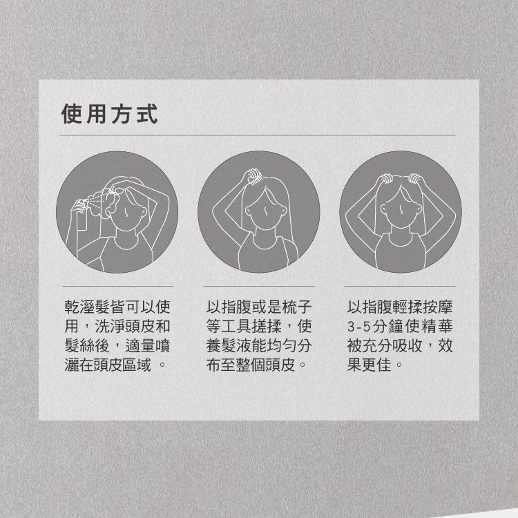 使用方法|噴灑於頭皮區域,搭配手指輕揉按摩。