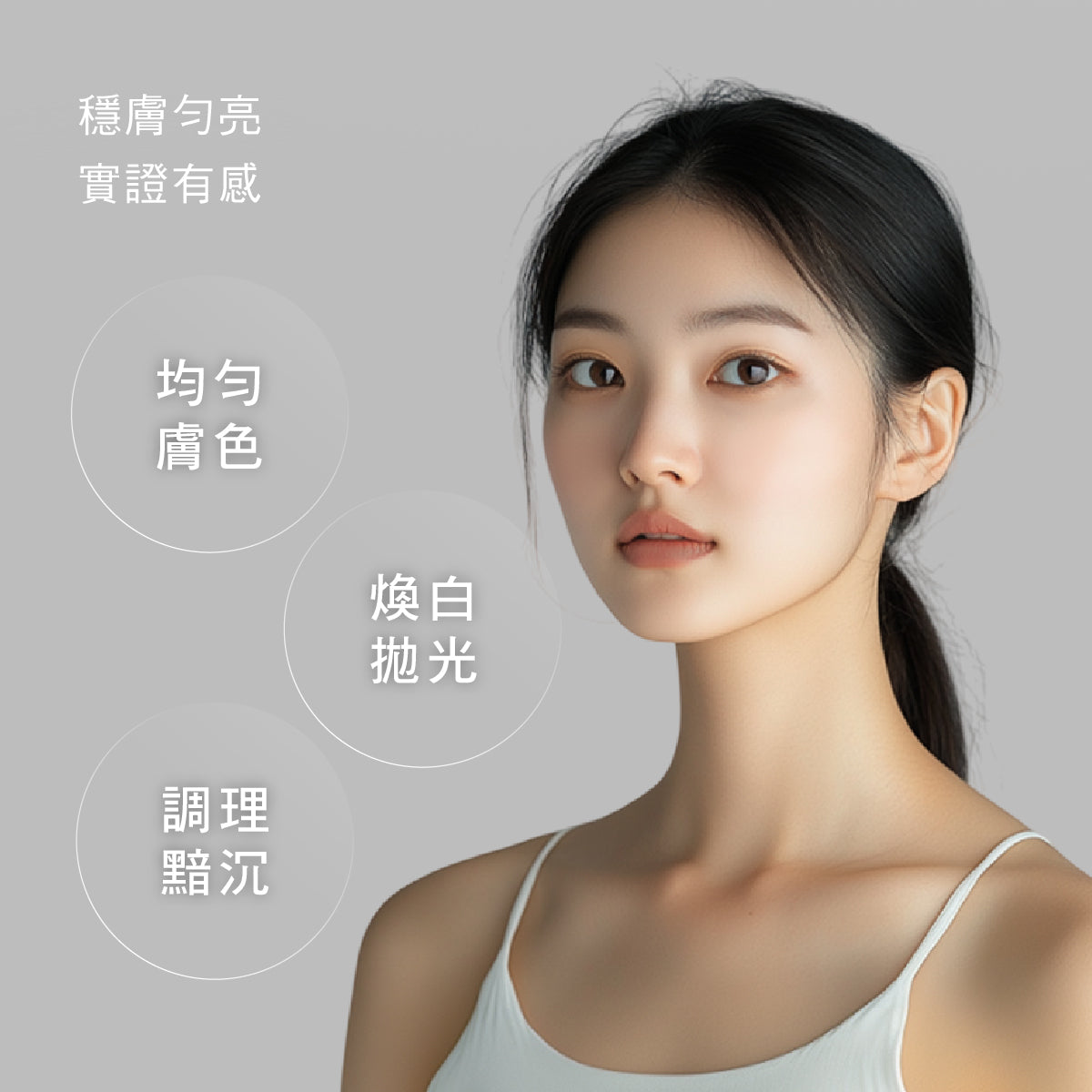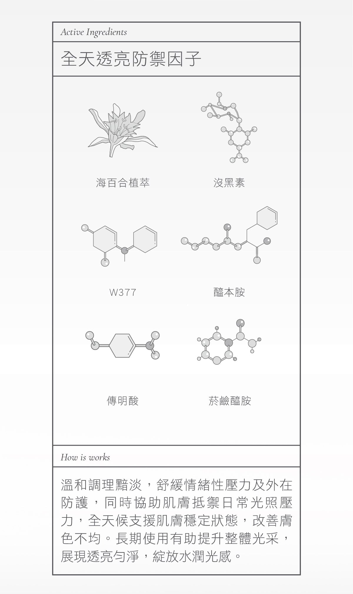 以海百合植萃為首,結合W377,專注調整黑色因子形成與防禦,持續改善黯淡膚感。搭配沒黑素與醯本胺,調理膚色同時提升肌膚對光照壓力的防護力,強調整體光澤感,讓肌膚穩定透亮。