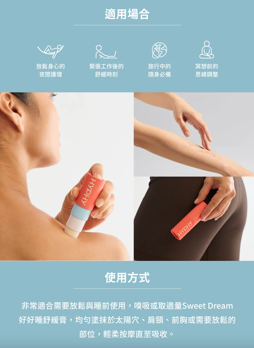 1、非常適合需要放鬆與睡前使用,嗅吸或請微量旋轉出膏體後,均勻塗抹於太陽穴、肩頸、前胸或需要放鬆的部位,輕柔按摩直至吸收。
