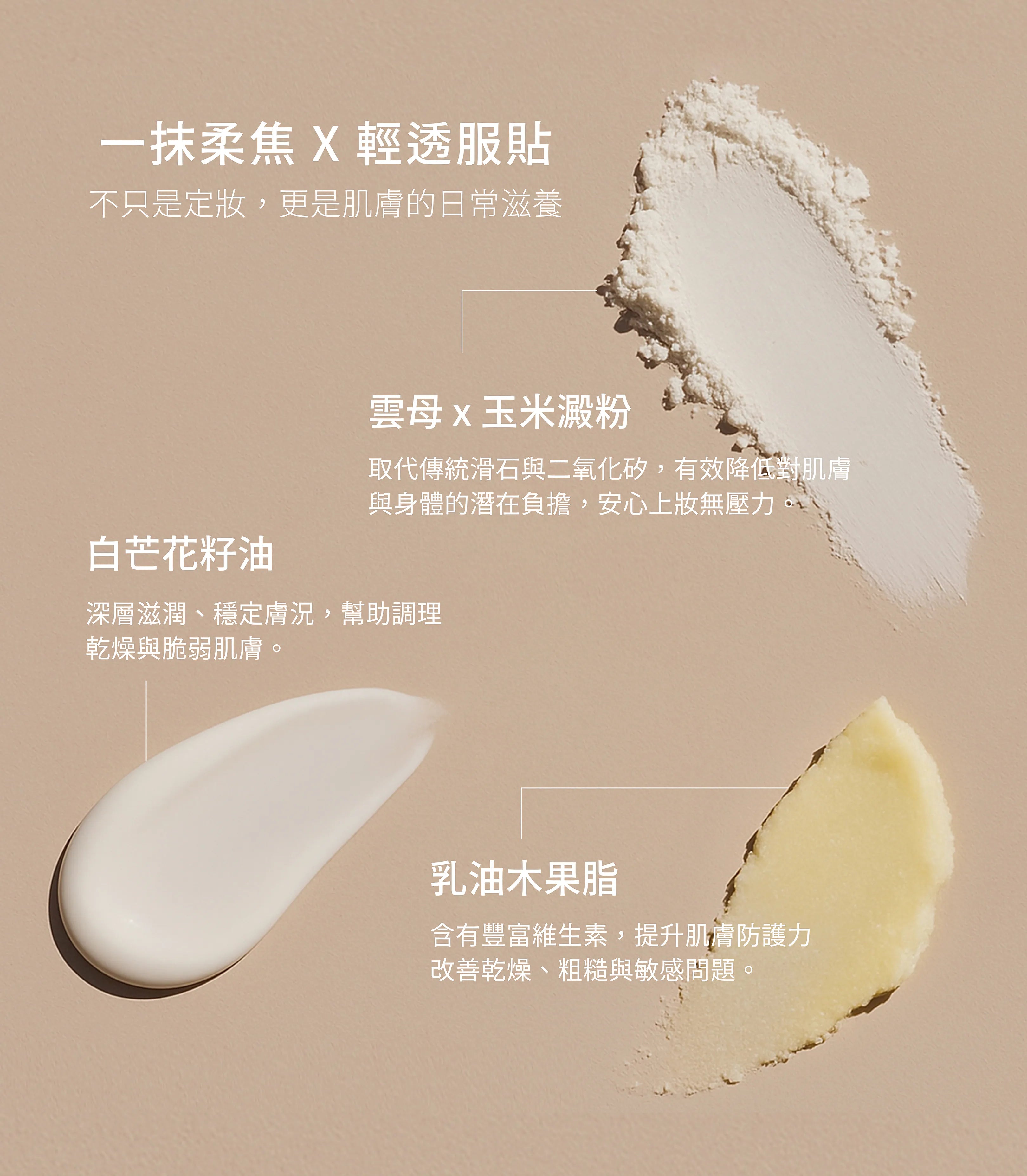 白芒花籽油 x 乳木果油 ,上妝同時養膚,在遮瑕與定妝之間,加入修護與安心。