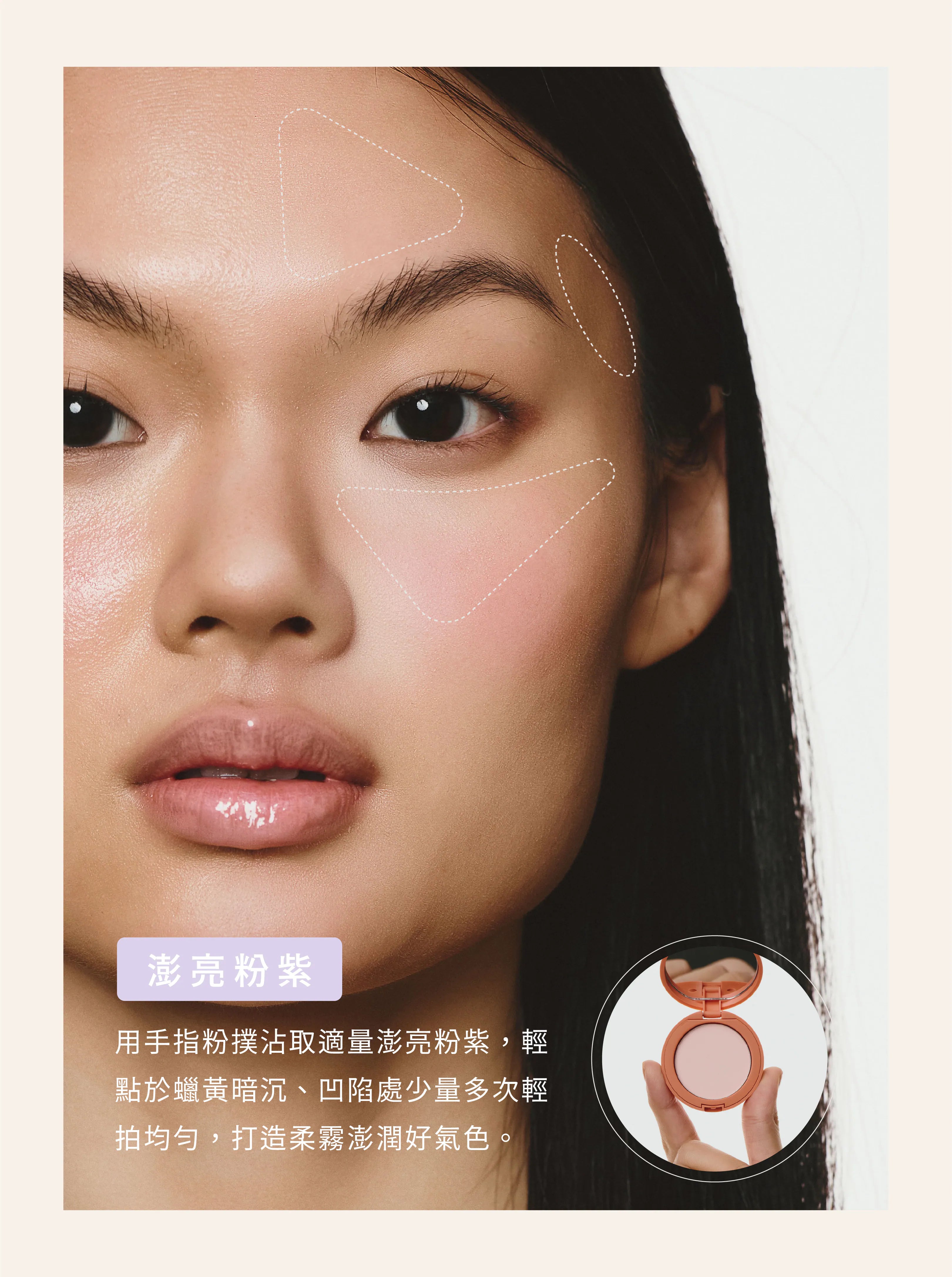 專為亞洲膚色調製的粉紫柔霧粉體,校正蠟黃、提亮暗沉,讓凹陷處視覺更澎彈。冷暖膚色皆適用,一拍即退去倦容,綻放清透光采。