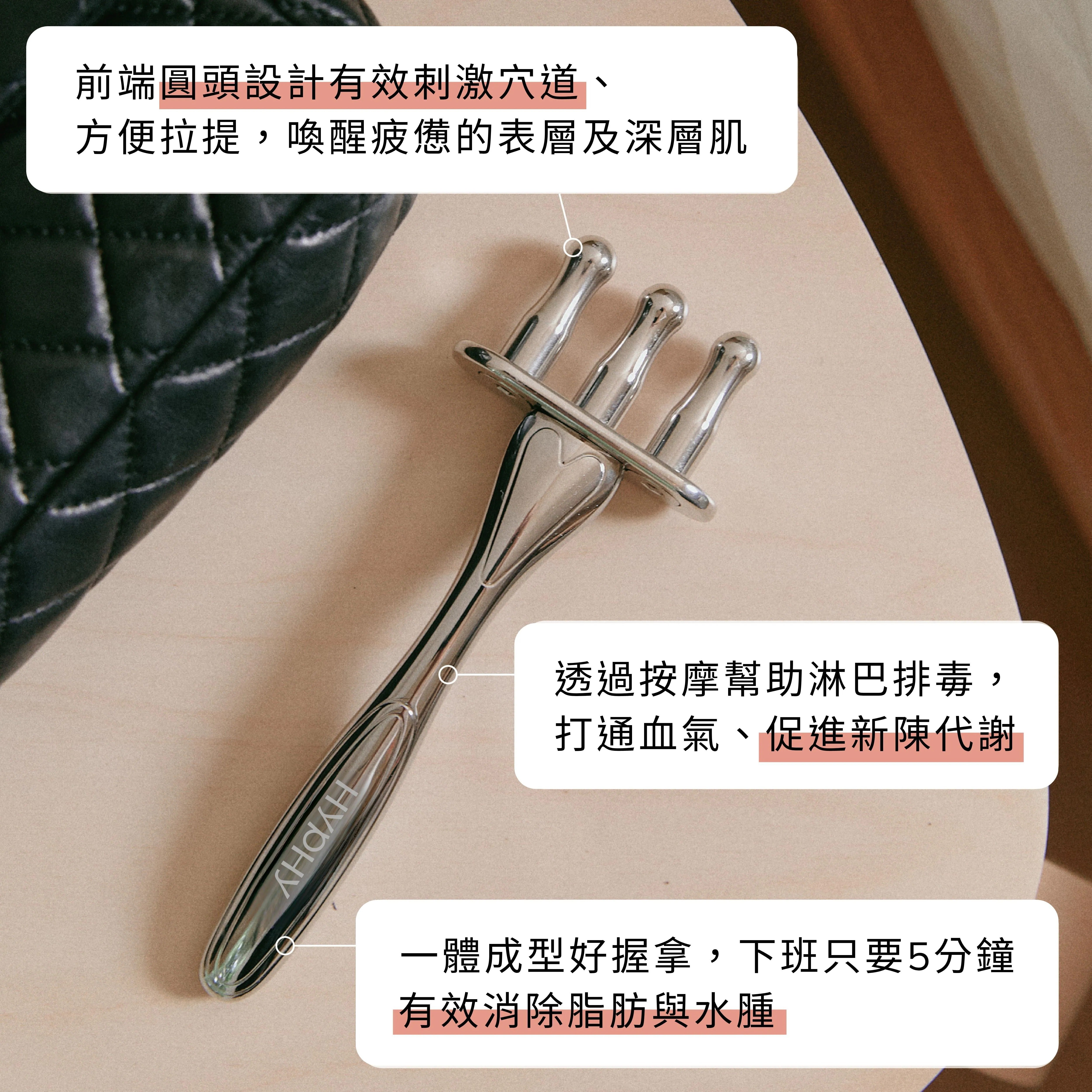 「HYPHY 磁力塑身儀」結合穴道按壓,可排解身體疲勞及多餘的水分,達到放鬆肌肉、排毒、刺激新陳代謝的效果,避免肌肉過度緊繃、陳年脂肪堆積。