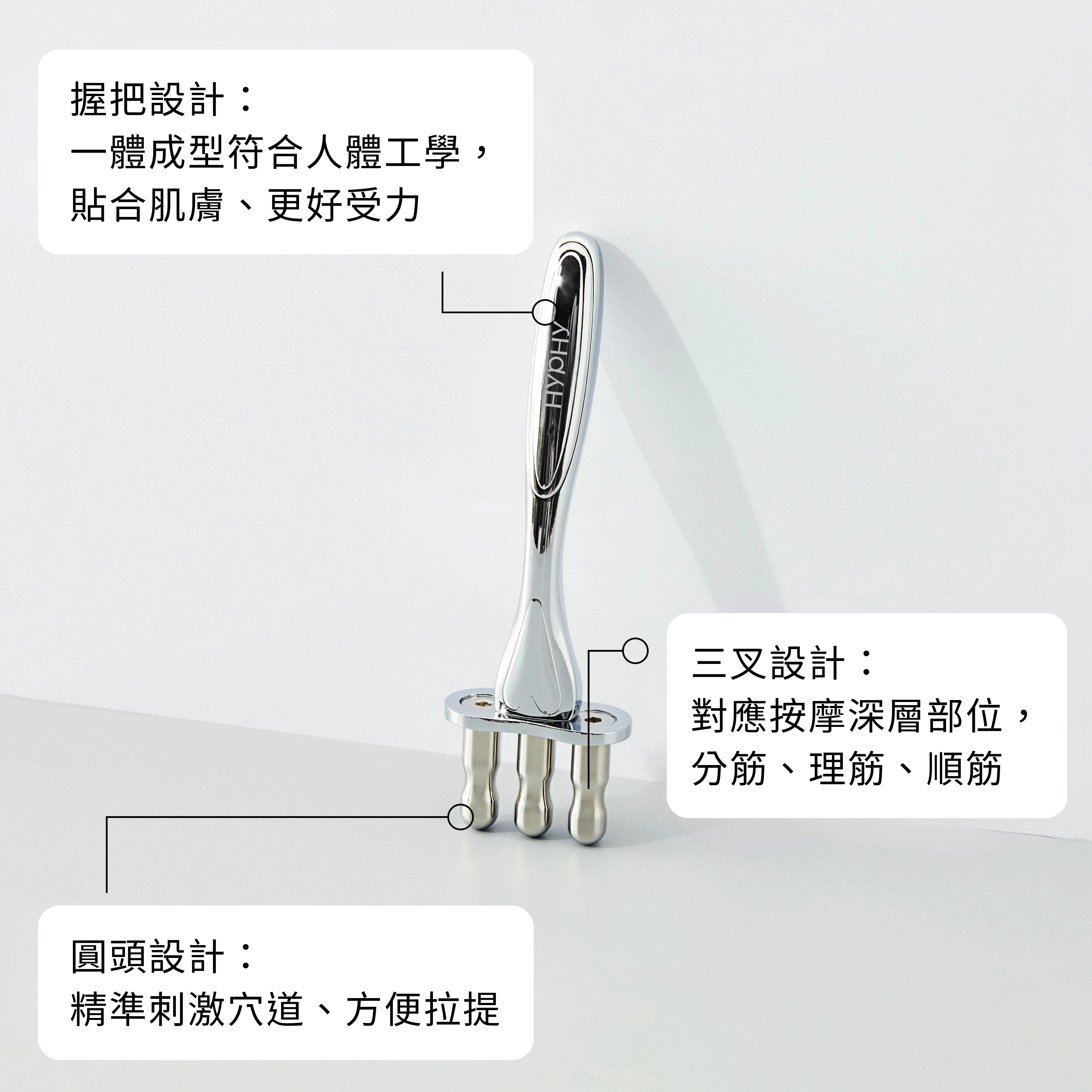 ◎ 三叉造型:可對應按摩深層部位,達到分筋、理筋、順筋,進而疏通淋巴阻塞、排酸效果。三叉設計同時能讓按摩力量分散,避免使用過程中帶來過度疼痛。