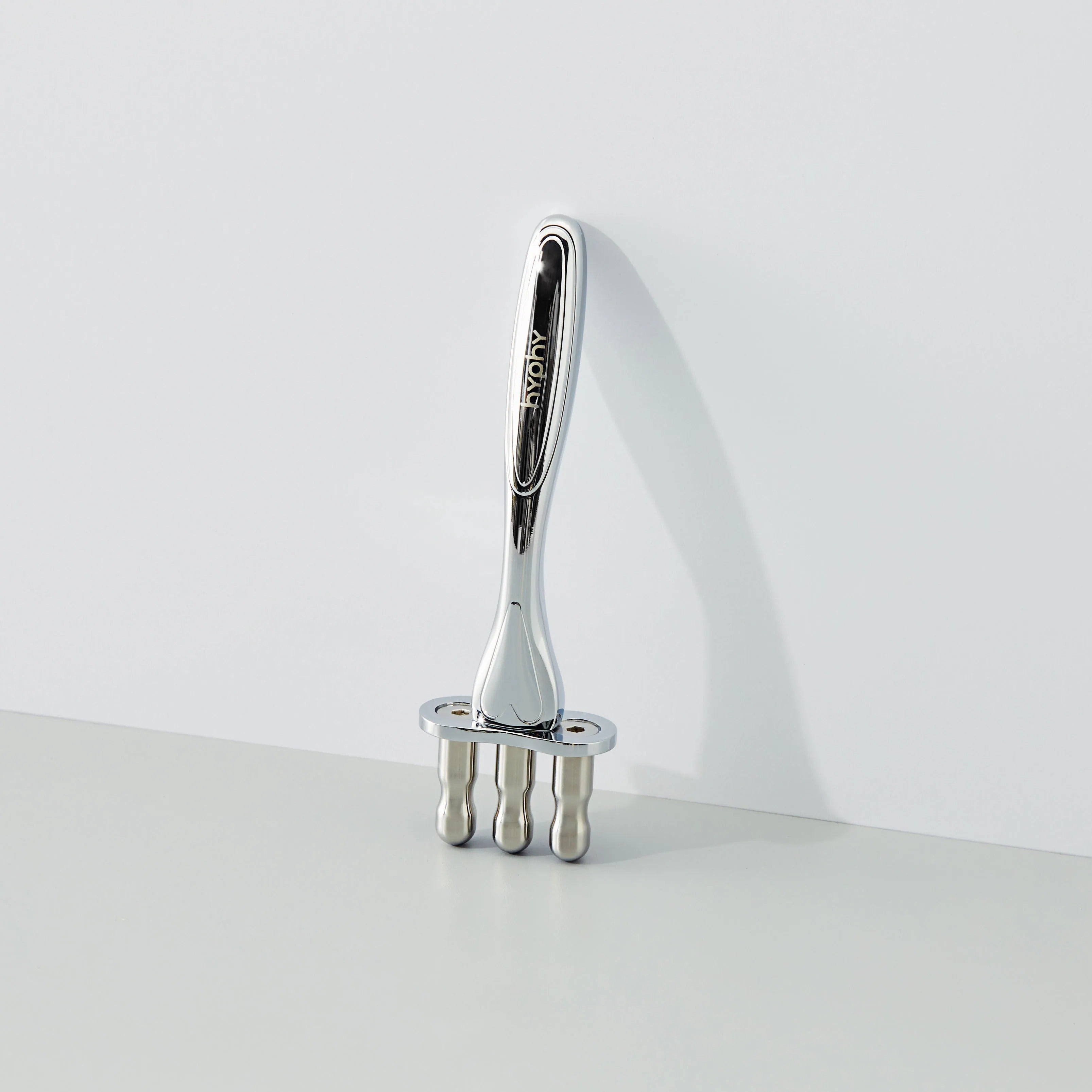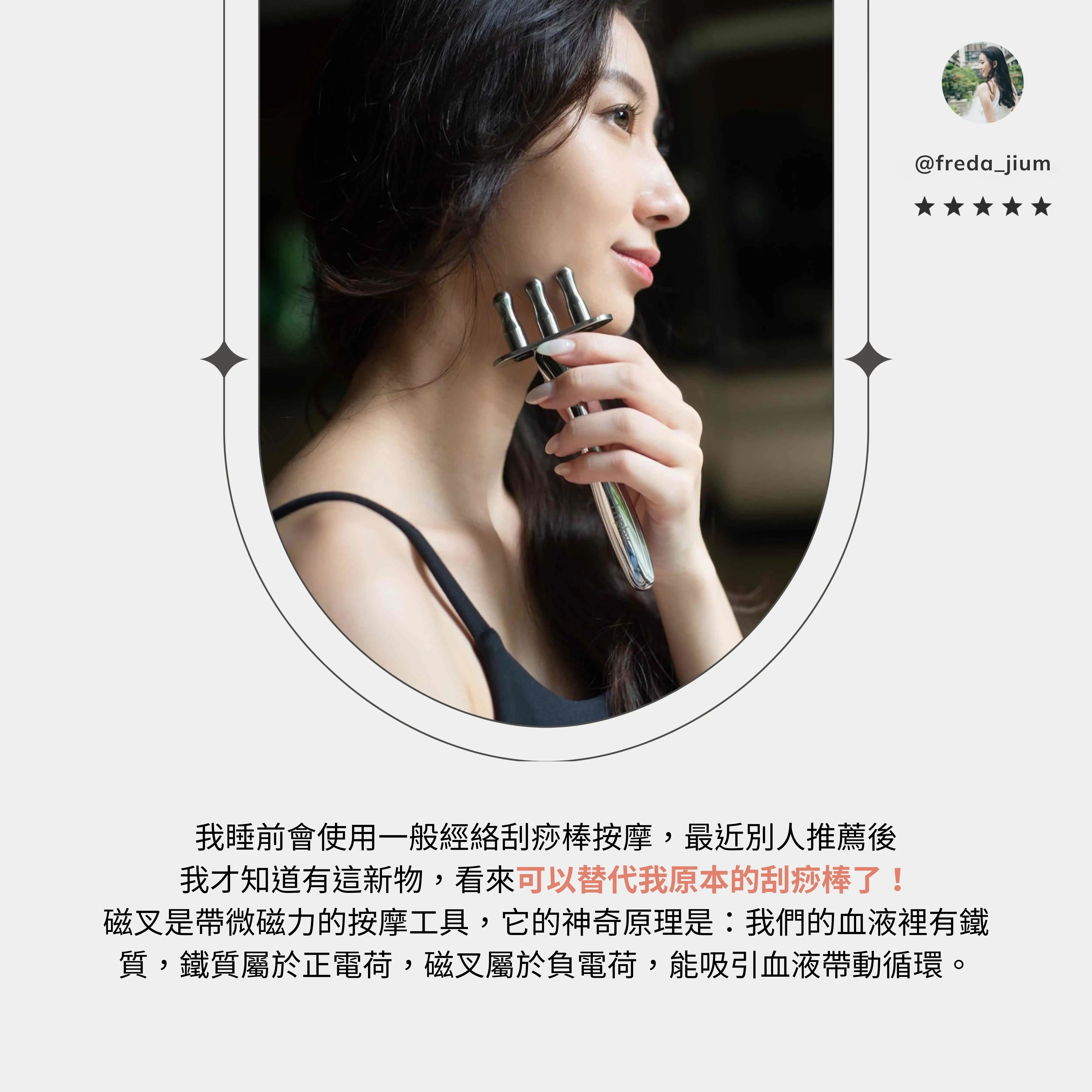「HYPHY 磁力塑身儀」除了專利的三叉設計讓按摩效果加乘之外,三叉部位以304不鏽鋼製成,並含有6000高斯磁力,按摩過程可藉由磁場正負極的能量達到共振作用、順暢身體的經絡穴位。